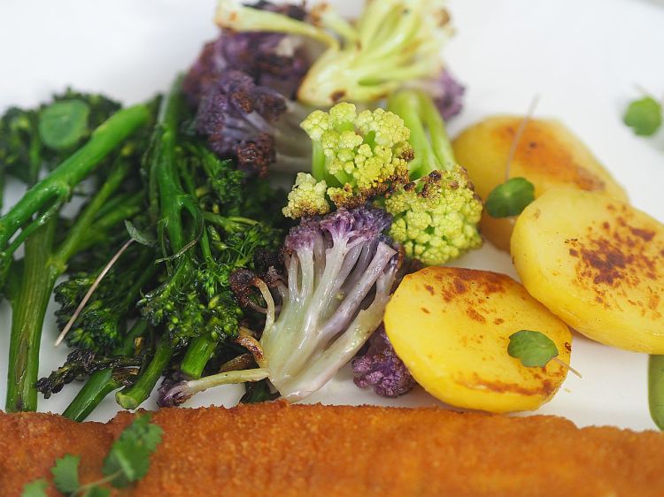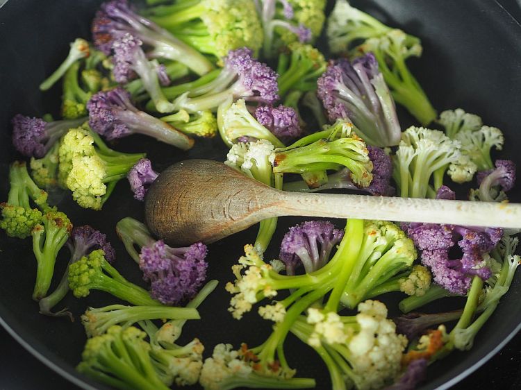 Weitere Beilagen: wilden Brokkoli und Karfiol in Olivenöl anbraten. Gekochte und angebratene Kartoffeln.