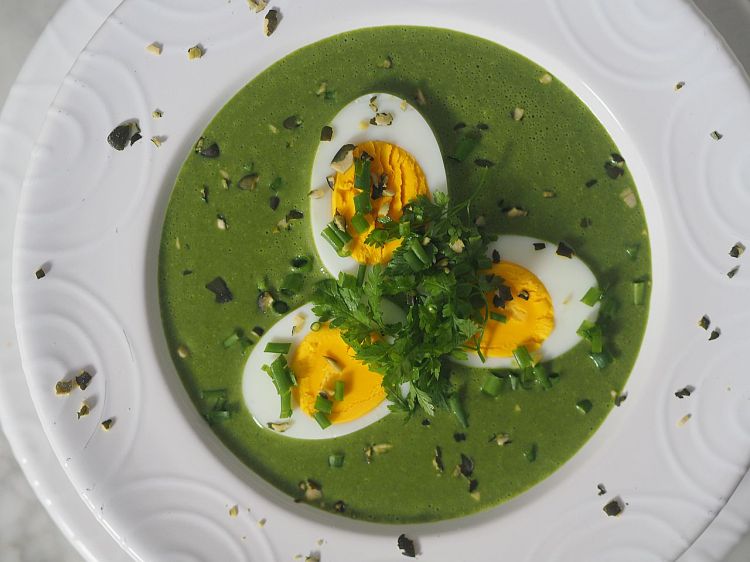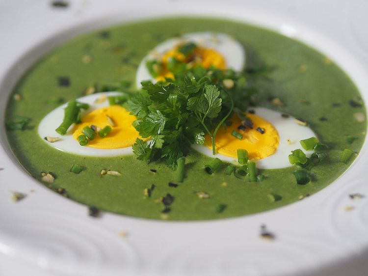 2 Erdäpfeln und eine Stange Lauch grob schneiden, in Olivenöl anschwitzen. Mit hausgemacher Gemüsebrühe aufgießen und weichkochen. Die Kräuter grob hacken, dazugeben. Nur leise köcheln, damit es die Farbe nicht verliert. Im Standmixer pürieren. Durch ein Sieb zurückgießen. Schlagobers dazu. Salzen. Dazu mit gekochtem Ei, Schnittlauch und Kresse garnieren.