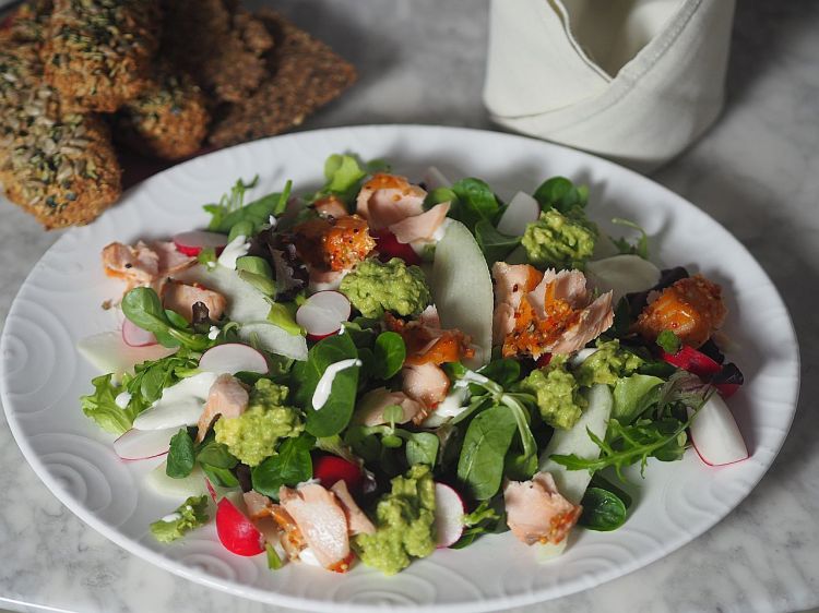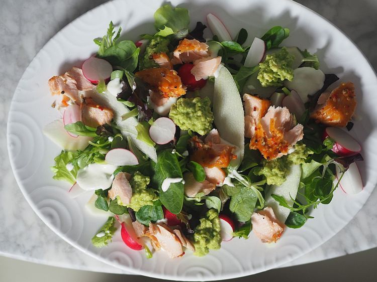 Stremellachs-Salat mit Avocado, Birne, Radieschen und Meerrettichcreme