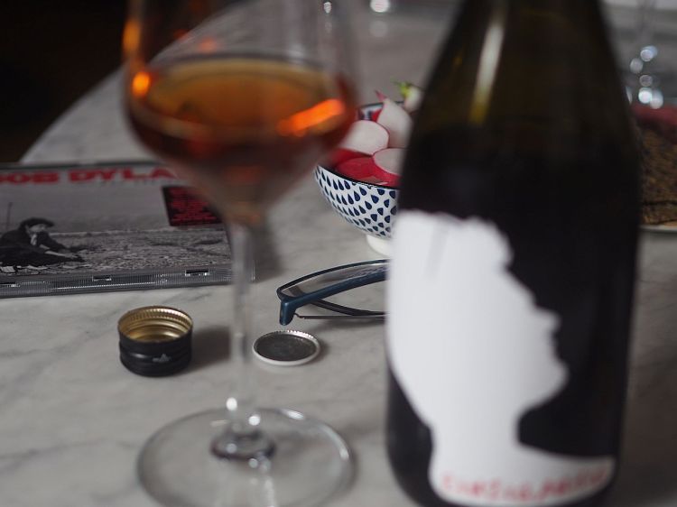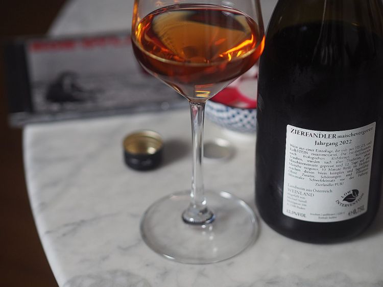 Wein: Zierfandler maischvergoren, 2022, Michael Sanoll, Baden bei Wien. Dieser Wein wurde ohne Maschinen nach alter Tradition hergestellt. Mit bernsteinerner Farbe wie der Whiskey.