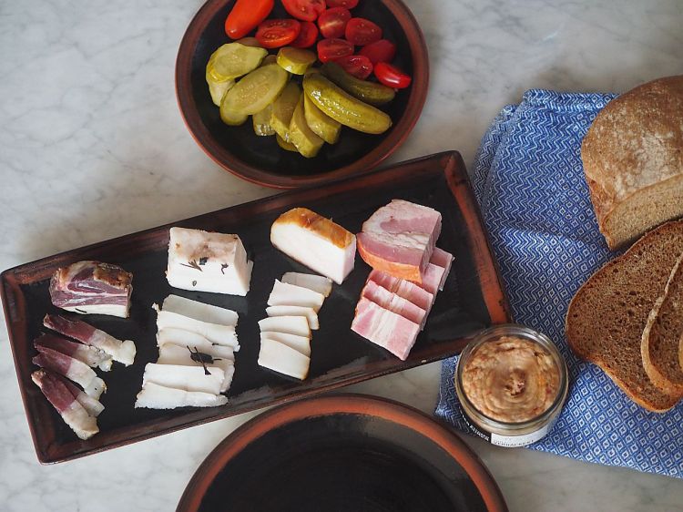 Wurzelspeck und Lardo vom Triebaumer, geräucherter Lardo und Császár szalonna (Kaiserspeck) aus Ungarn.