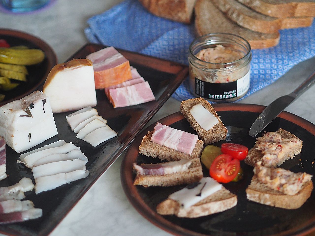 Zu Hause angekommen, nach „Fun, fun, fun of the Autobahn“, gab es dann Speck in seinen mannigfaltigen Arten. Wurzelspeck und Lardo vom Triebaumer, geräucherter Lardo und Császár szalonna (Kaiserspeck) aus Ungarn. Dazu Verhackertes. Das Brot, ein feinporiges eher helles Brot, erinnert die Küchenfee an etwas, bloß an was? Wir müssen also noch einmal hinfahren, nach Rust, sonst kommen wir nie dahinter.