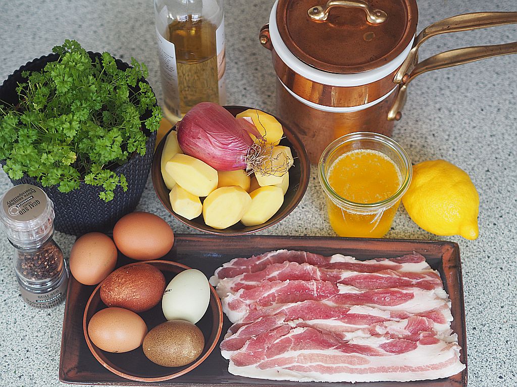 Inspiriert von „Potato Rösti with Poached Eggs, Bacon and Hollandaise“ von Peter Gordon, „Eating Well Everyday“, 2012, HarperCollinsPublishers, unsere Ausgabe ist von 2018 von Jaqui Small. Wir haben uns dieses Buch gebraucht aus England schicken lassen.