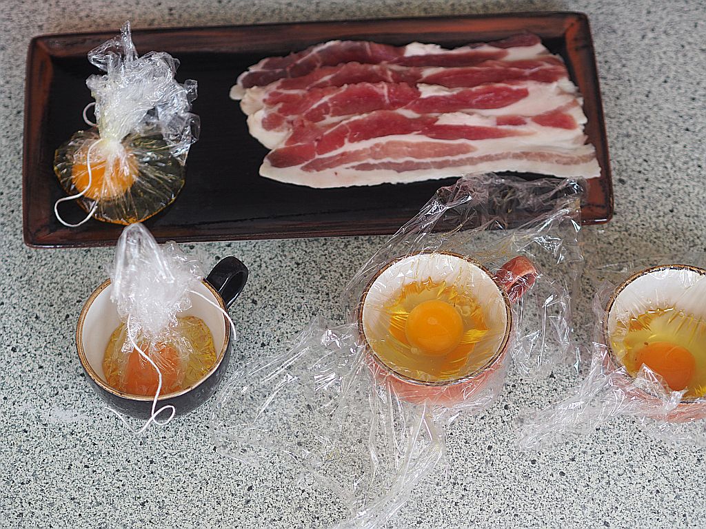 Egg Benedict besteht aus gebratenem Frühstücksspeck, Toast, Sauce Hollandaise und verlorenen Eiern. Es ist nicht ganz einfach, rohe Eier in einem Topf mit brodelndem Wasser derart zu verlieren, daß sie sich nicht darin auflösen. Aber alles kein Problem, die Hofköchin ging nach der bewährten Kaffeetassen-Methode vor, siehe hier.