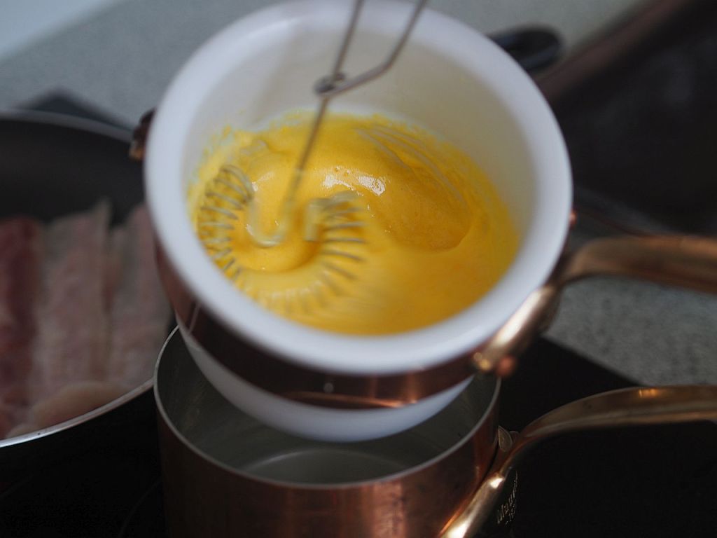 Sauce Hollandaise ohne Schalotten-Estragon-Noilly-Prat-Reduktion. So wie es die Hofköchin gemacht hat. Für das Wasserbad kam eine Bain Marie von Mauviel zum Einsatz, man kann aber auch zwei Töpfe ineinander stellen, wie Peter Gordon oder Paul Bocuse.