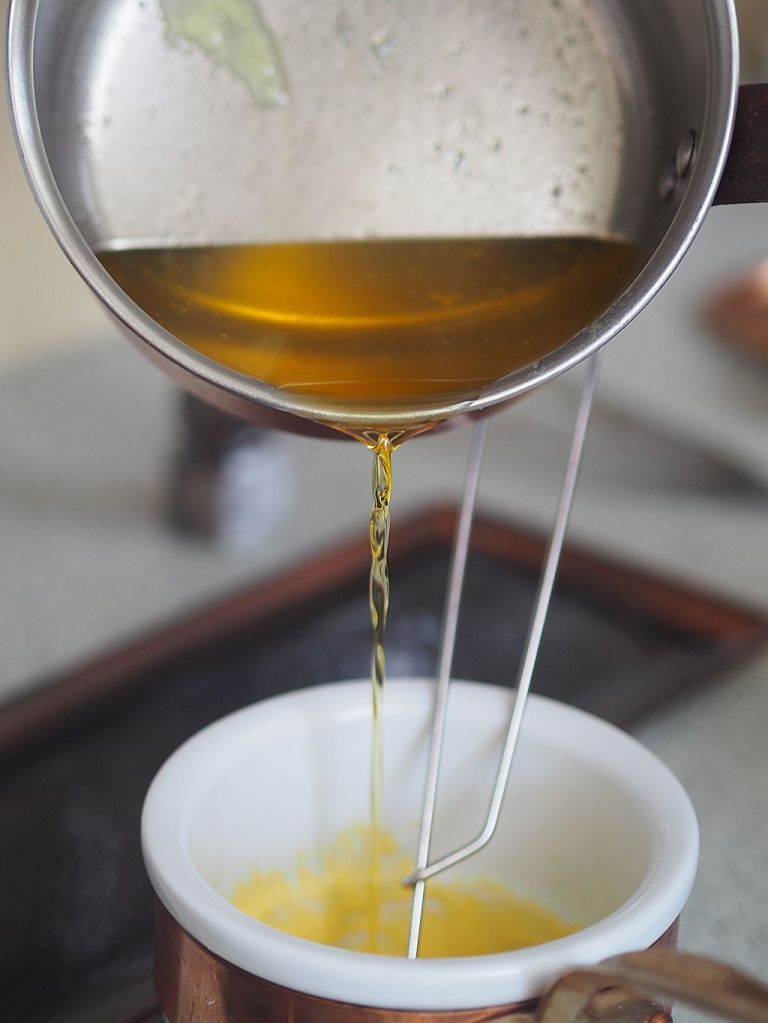 Butter in einem Topf langsam erwärmen, bis das Wasser verdampft und sie eine leicht bräunliche Farbe bekommt.