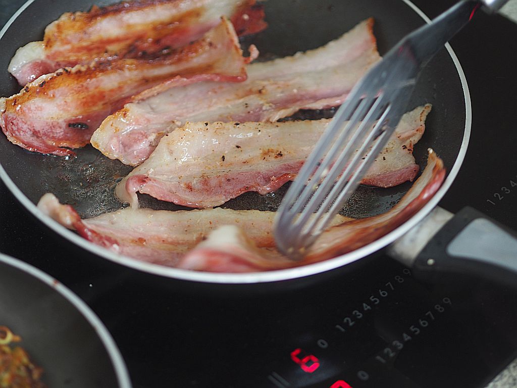 Für die Rösti raspelt man grob geschälte, rohe Kartoffeln, quetscht sie aus, sodaß sie ihr Wasser verlieren. Ansonsten wird es schwierig, sie knusprig zu machen und das Gericht verlöre seinen Reiz. Man vermischt sie mit grob gehackter Petersilie und Schnittlauch-Röllchen, bildet feste Klumpen, die man in einer Pfanne mit wenig Öl herausbratet. Den Frühstücksspeck braten.
