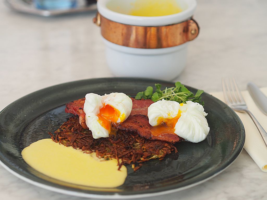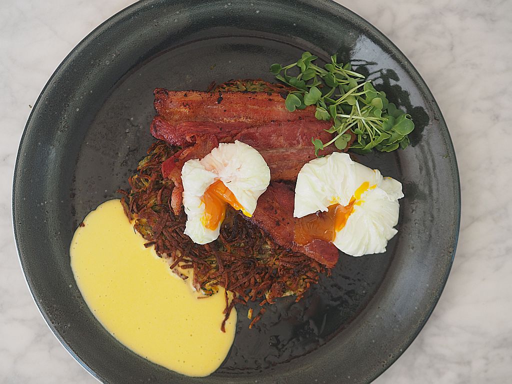 Egg Benedict gewinnt seinen besonderen Reiz aus dem Gegensatz zwischen knusprig und cremig. Rösti und Sauce Hollandaise. Gebratenem Speck und verlorene Eier. Wer die Möglichkeit hat, Egg Benedict zu essen, sollte die Gelegenheit nutzen. Und ich nutzte sie.
