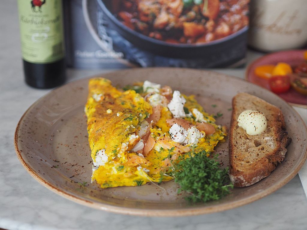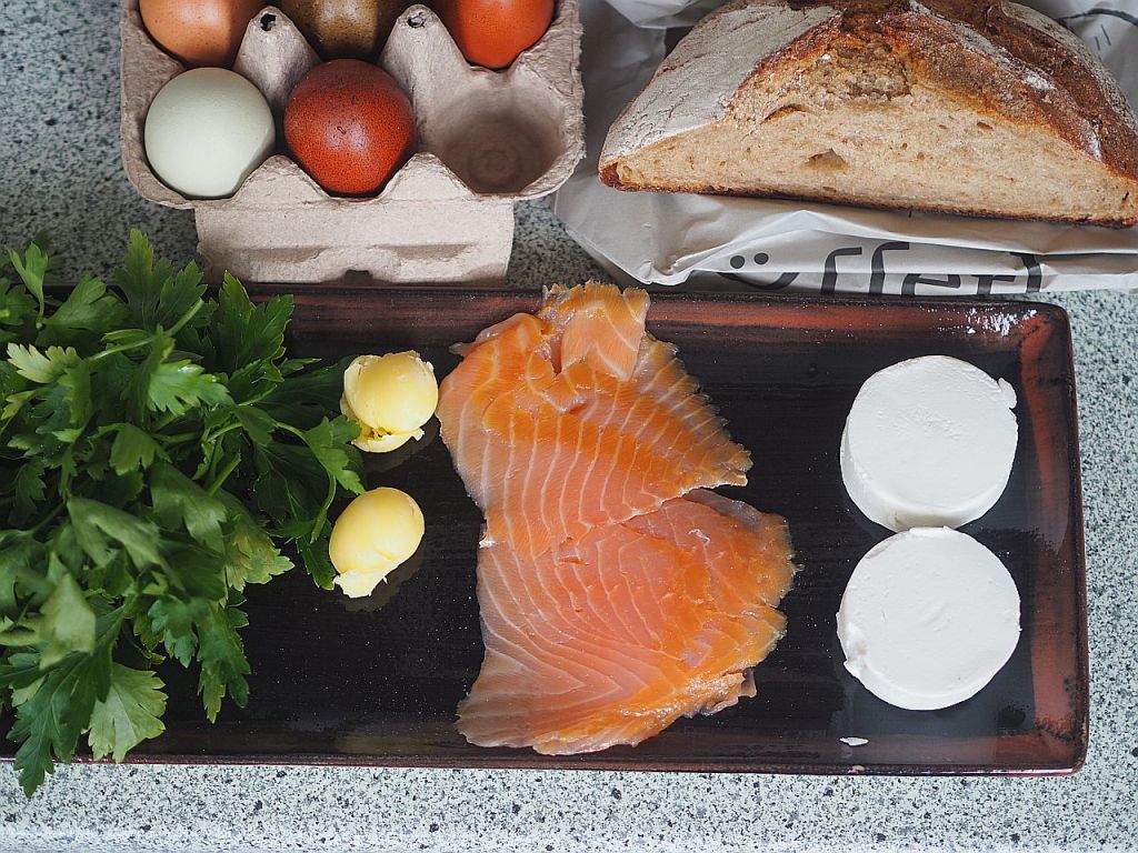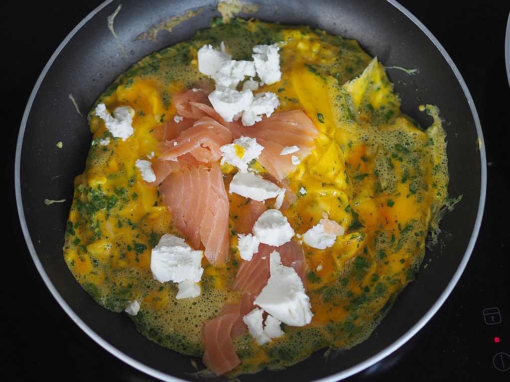 5 Maran-Eier, 1/2 Bund Petersilie, Salz, Pfeffer, 2 Flocken braune Butter (aus der Vorratskammer), 100 g geräucherter Lachs, 80 Ziegentaler Geitenkaas (Ziegenfrischkäse)