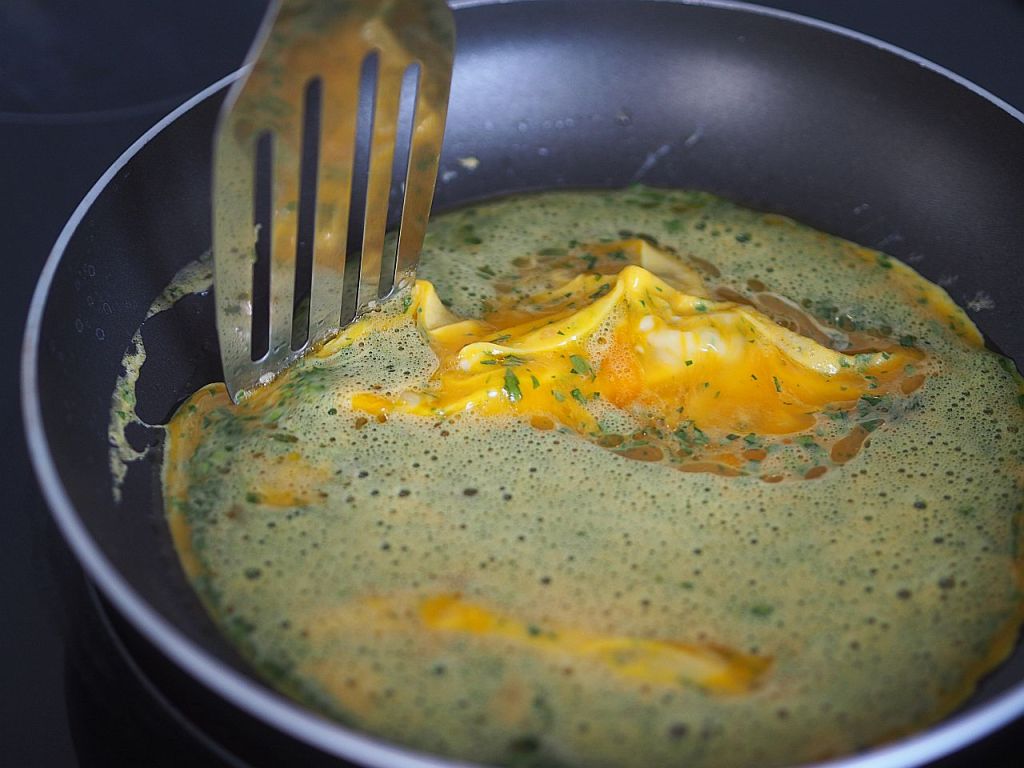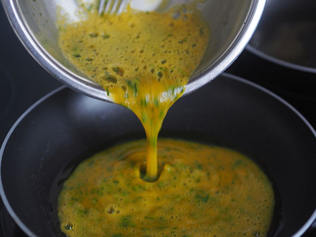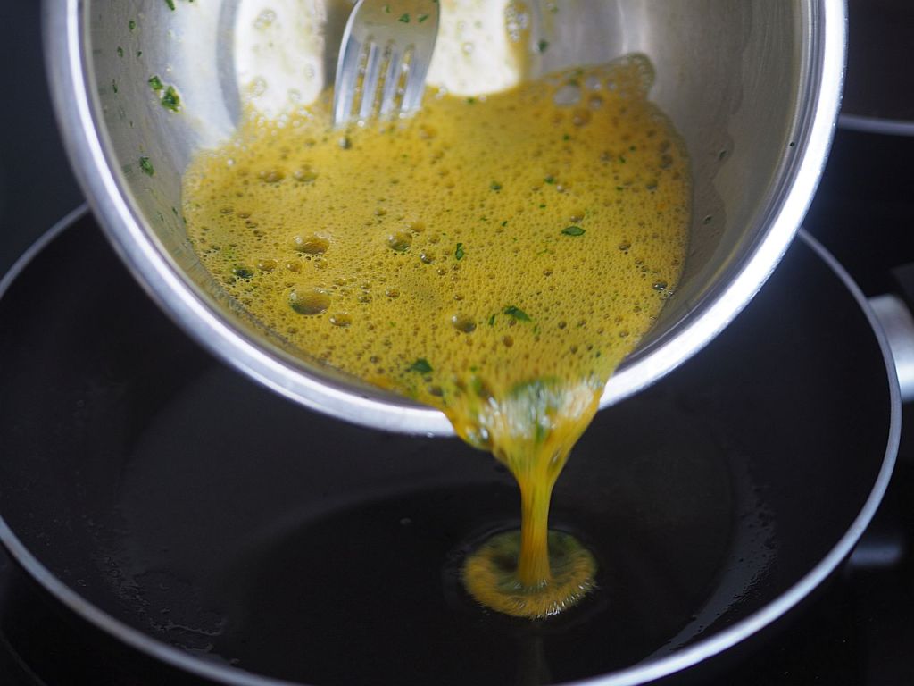 In eine Schüssel die Eier schlagen, gehackte Petersilie dazu geben. Salzen, pfeffern. Eier 4 Sekunden mit einer Gabel verrühren.