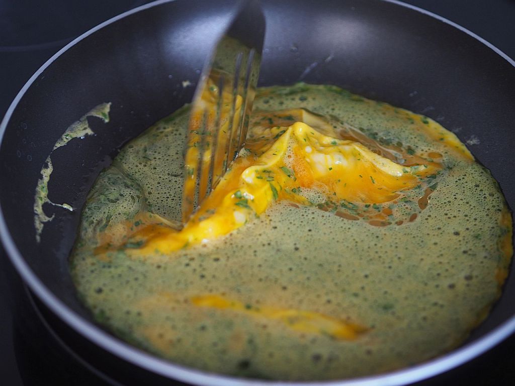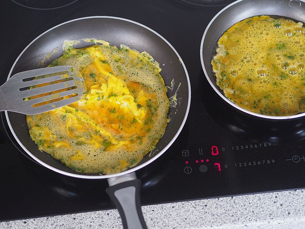 Jeweils in einer Bratpfanne die Hälfte der Butter wärmen, die Hälfte der Eiermasse hineingeben. Sobald sich am Rand die Eiermasse angesetzt hat, das Angesetzte von außen nach innen schieben , sodaß das Flüssige nach außen fließt und sich ansetzen kann.