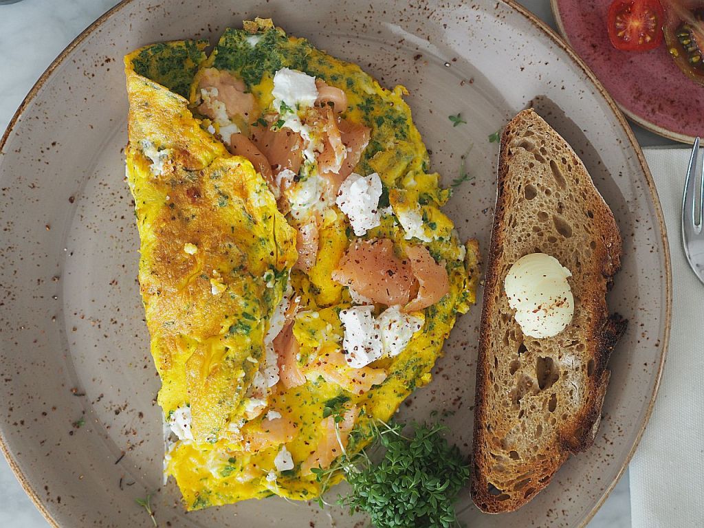 Die Hälfte des in Streifen geschnittenen Lachs und die Hälfte des zerkrümelten Ziegenkäses in die Mitte legen und für 5 Sekunden dort liegen lassen. Dann das Omelett über die Füllung umschlagen und servieren. Mit Kresse garnieren.