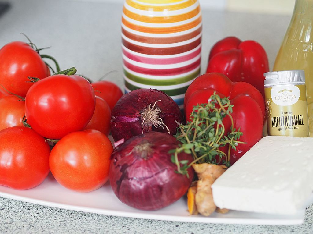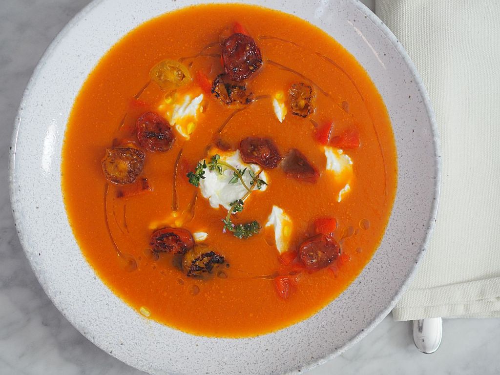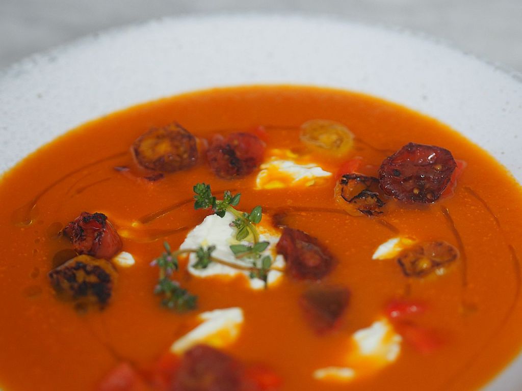 Diese Suppe ist wie ein eingeschmolzener griechischer Bauernsalat: mit Tomaten, Paprika und Schafkäse – nur die Salatgurke fehlt. Dafür mit karamelisierten Cherry-Tomaten und Paprika. Die Kurkuma verleiht dem Ganzen eine erdige Note. Der Mensch lebt nicht von Brot allein. Es folgt das Rezept, wie es die Hofköchin gemacht hat.