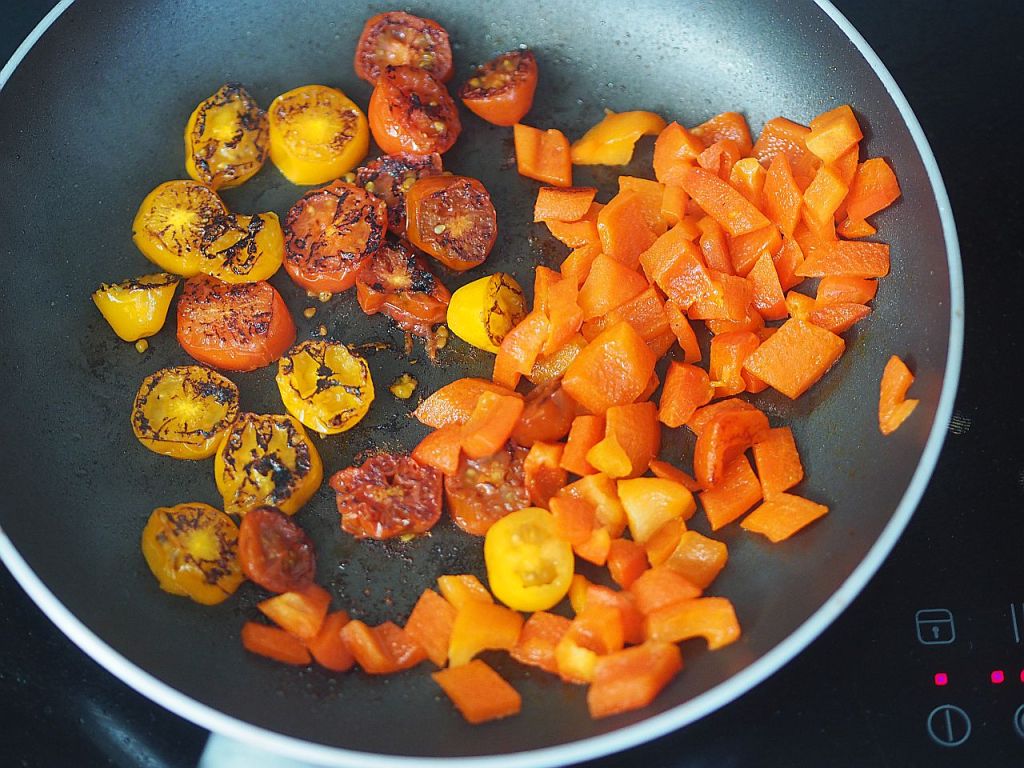 6. Für die Einlage: In Scheiben geschnittene bunte Cherry-Tomaten, geschälte und gewürfelte Paprika in Olivenöl in einer Bratpfanne braten.
