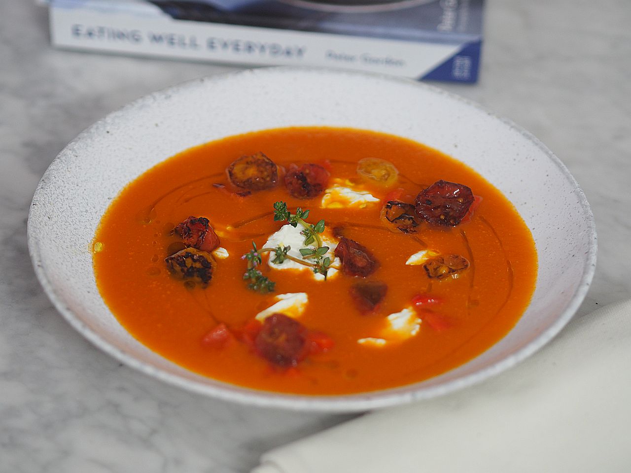 Inspiriert von Peter Gordon „Eat Well Everyday”, “Tomato, Red Onion and Capsicum Soup with Feta Cream” p. 47
