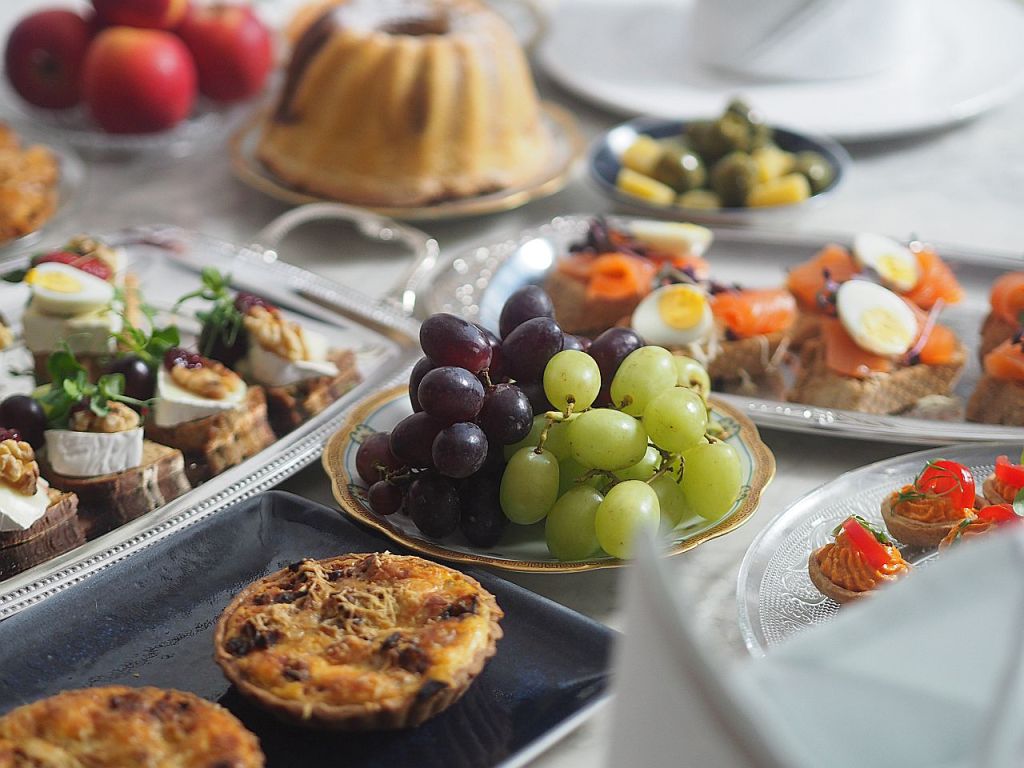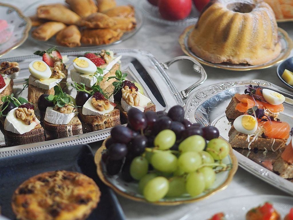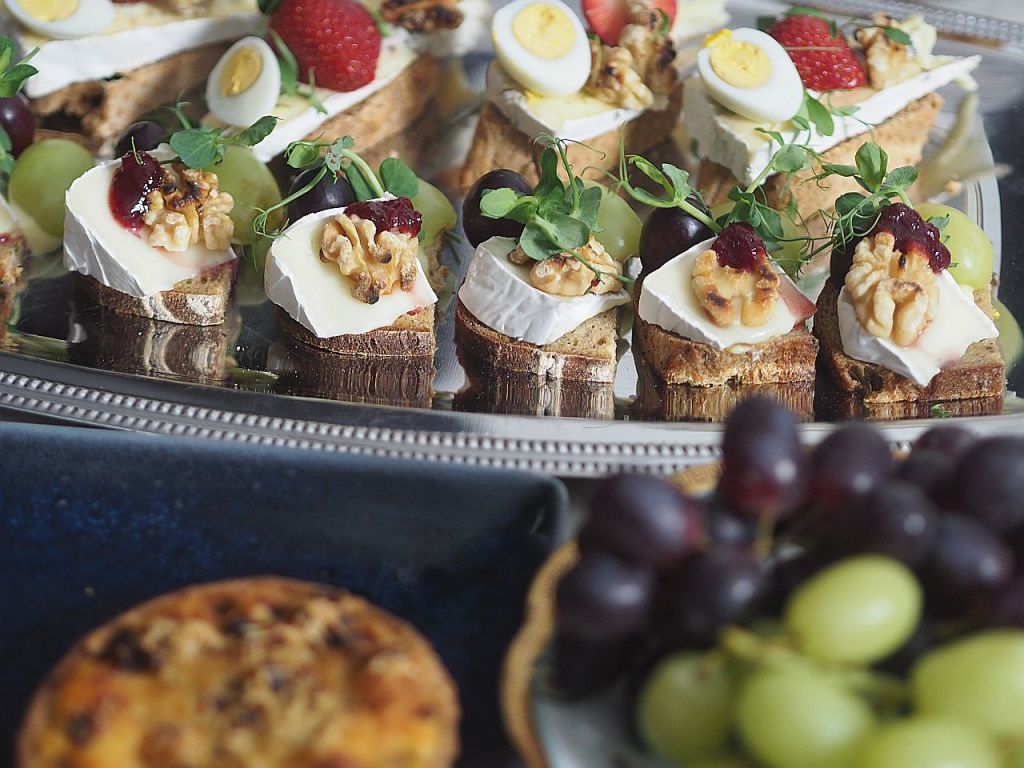 Canapés mit Ziegen-Camembert, Weintrauben und Walnüssen