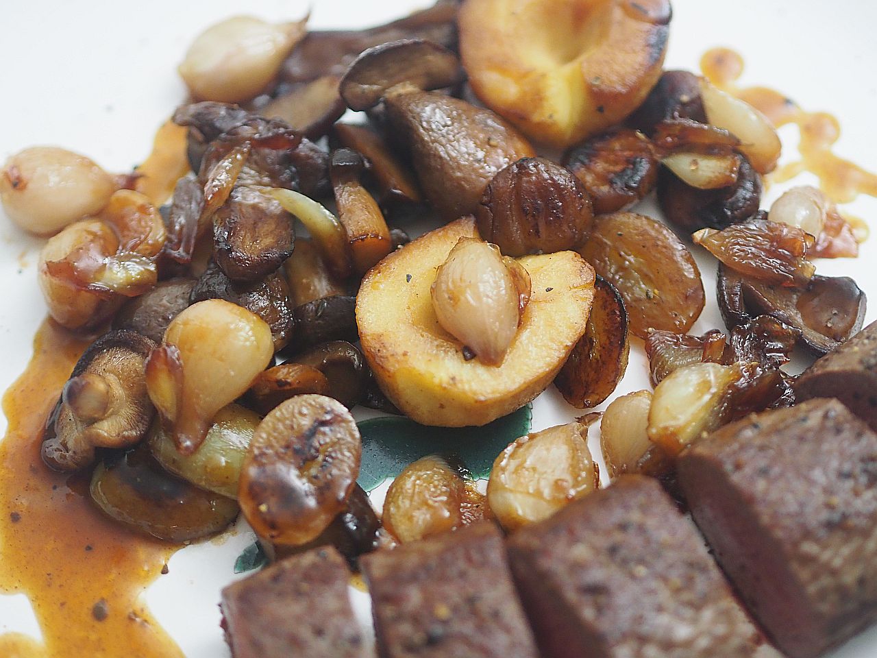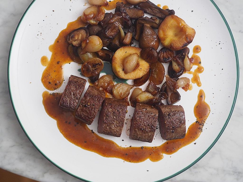 im Schmortopf zubereitet, Pfeffersauce, Herbstfrüchte und -gemüse nach Försterinnenart.
