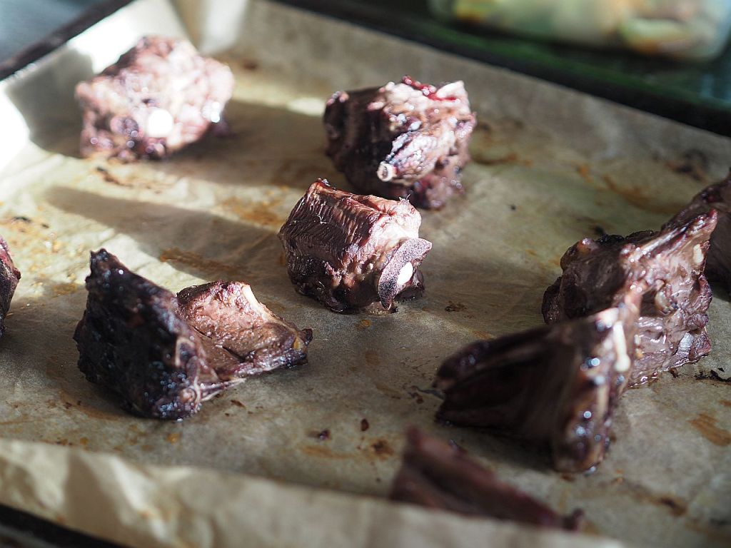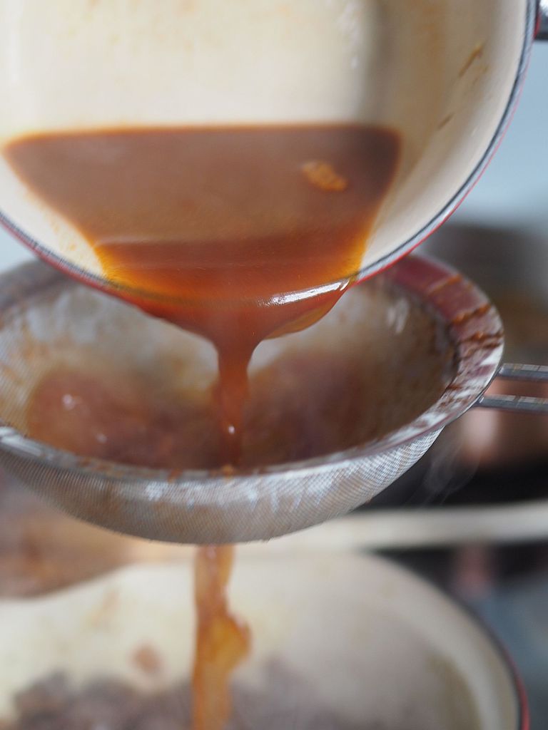 So nah sind wir noch nie an dieses Rezept gekommen. Beim Grabner-Jäger am Markt in Bad Vöslau haben wir einen Hasen im Ganzen bekommen. Und so können wir dieses Mal auch den geforderten Kaninchenjus machen, sowas gibt’s ja nirgends zu kaufen. Ich weiß schon, Hase und Kaninchen sind nicht dasselbe. Aber bei uns gibts halt Hasen und keine Kaninchen. Wie auch andere Zutaten abgetauscht wurden. Statt Rosinen gibt’s Cranberrys und statt Pecorino einen österreichischen Hartkäse vom Schaf. Dieses Rezept hat die Hofköchin schon ein paar Mal gemacht und es hat uns immer geschmeckt. Einmal waren Gäste da, denen hat‘s auch geschmeckt, aber nur so lange bis sie gewußt haben, daß es Hase war. Deshalb macht die Hofköchin das nur mehr für uns zweien.