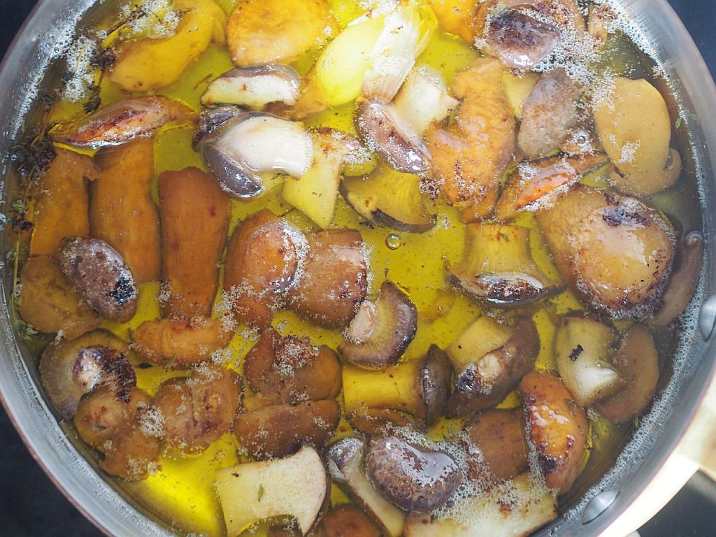 Beim Kochbücherwälzen kamen wir zu Johann Lafer „Himmlische Sterneküche“. Dort gibt es auf S. 60 „Gebackene Rehschnitzel mit Pfifferlingsragout und Preiselbeerspätzle“, daraus reifte dieses Gericht. Die Spätzle haben uns nicht gefallen, stattdessen gibt’s sautierte Erdäpfeln in Knoblauch. Ob das mit den Rehschnitzeln zusammenpaßt, werden wir schon sehen.