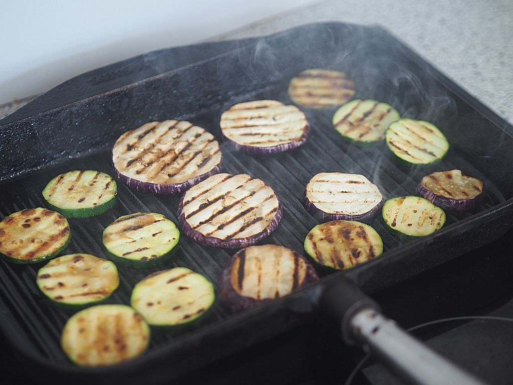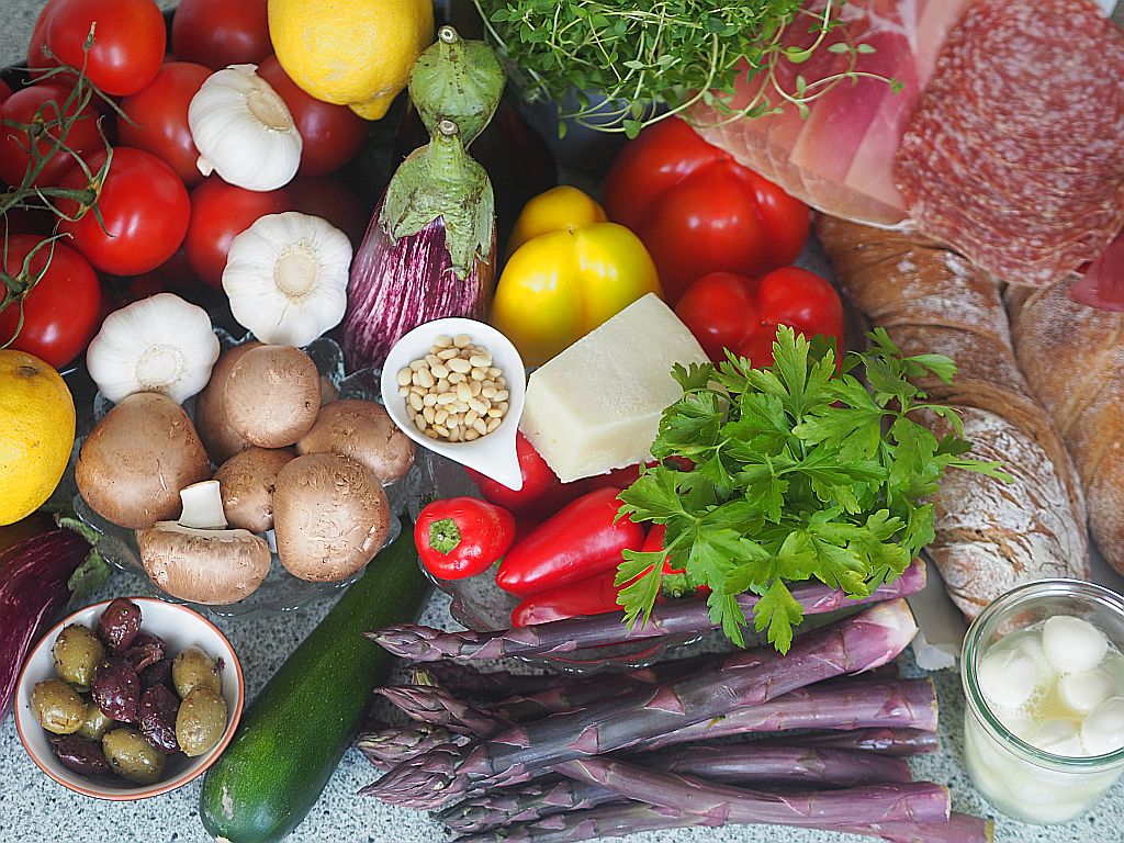 Melanzani, Zucchini und Tomaten sind von blün, Wien. Knoblauch aus Ungarn, Kräuter von Altschachl, Oliven und Olivenöl aus Italien, Champignon aus Tyrol. Salami und Prosciutto aus Italien.