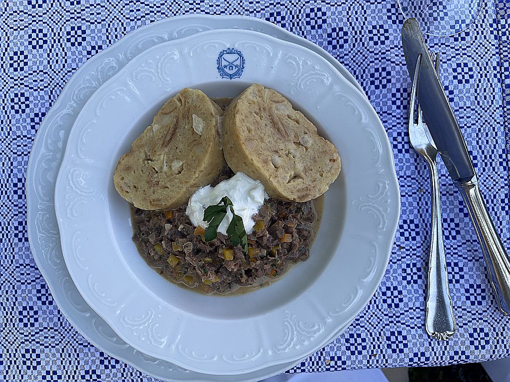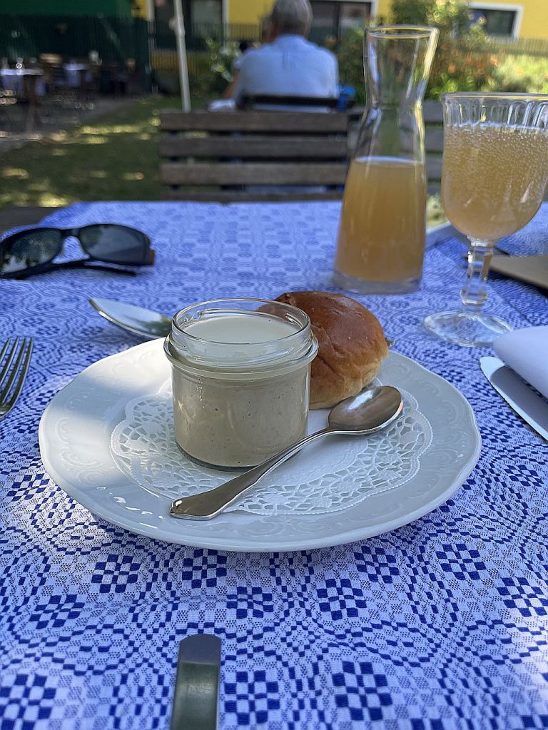 Dazu Brot von Öfferl, hergestellt auf die althergebrachte Art mit Sauerteig: ein Baguette „Crousto“ mit einer Weizen- und Roggenmehlmischung und ein Baguette “Capo” mit dem gleichnamigen Weizenmehl. Brot mit Sauerteig braucht nur wenige Zutaten: Mehl, Sauerteig, Wasser und Salz. Das Brot wurde gekauft in der Inneren Stadt, und von dort aus ging es ins Burgenland zur Dankbarkeit in Podersdorf, zu einer jiddischen Hühnerleber und einem Beuschl mit Serviettenknödel bzw. Rote-Rüben-Couscous mit Kräuterjoghurt. Dabei kamen wir vorbei bei Iris‘ Hofladen in Purbach, wo wir frische Erdbeeren, weiße und violette Maulbeeren, Kirschen, Paprika und violetten Spargel erstanden. Und wenn wir schon einmal ins Burgenland fahren, dann machen wir auch einen Abstecher zu Umathum, wo wir uns mit Sekt, Pinot Noir und Sankt Laurent eindeckten.