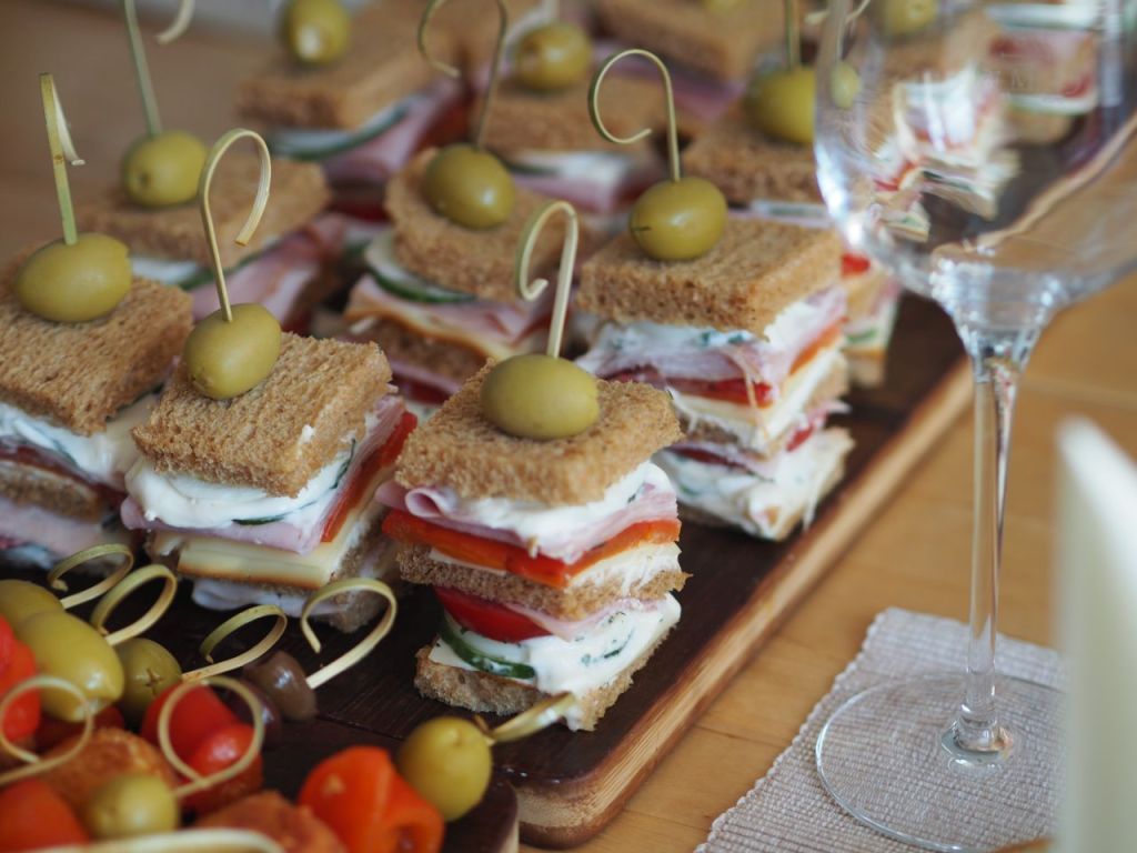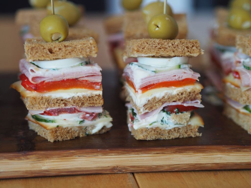 Das Toastbrot entrinden. Die erste Brotscheibe mit Mayonnaise bestreichen. Der Belag wird wie folgt aufgeschichtet: geräucherte Käsescheiben, dünn aufgeschnittene Tomaten, Gurken, Mayonnaise und gekochte Eier, grob gehackte Kräutermischung und eine Schinkenscheibe. Dann eine Toastbrotscheibe darauf legen. Nächste Schicht bestehend aus: Frischkäse, frisch geraspelter Kren, eine Scheibe geräucherter Kuhmilch-Schnittkäse (Bergbaron), gegrillte und enthäutete rote Paprikascheiben, Schinken, Gurken, gekochte Eier, Mayonnaise und mit Toastbrot abschließen. Den Sandwichturm vierteln und mit einem Spieß mit einer mit Knoblauch gefüllten Olive aufspießen.