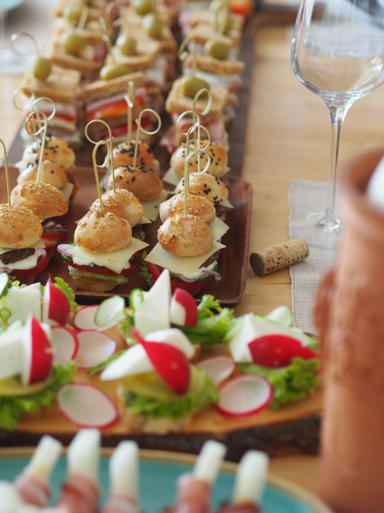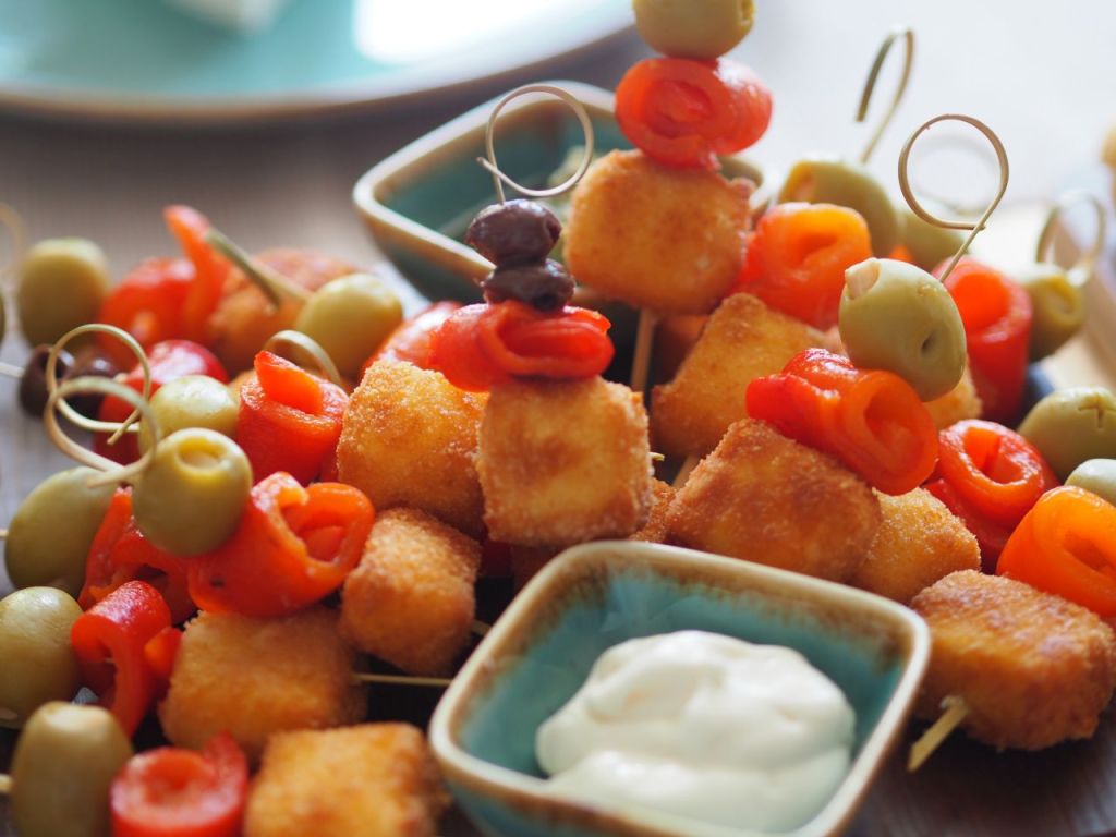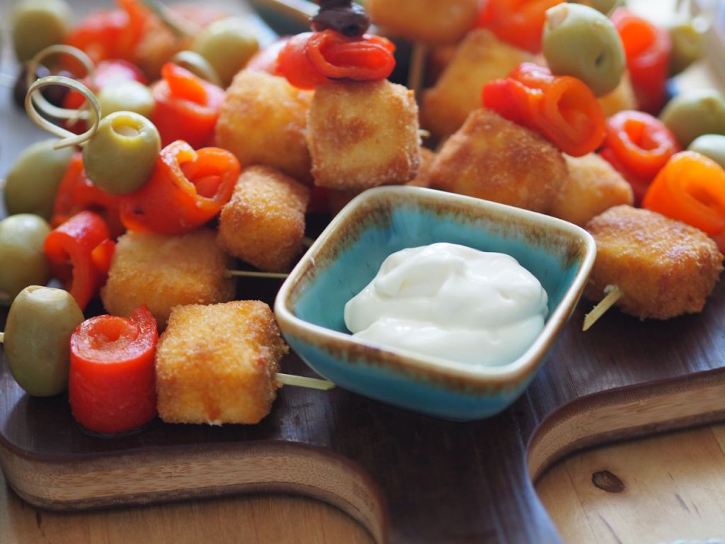 Schafkäse in Würfel schneiden, panieren, frittieren. Mit Knoblauch gefüllte Olive, eine Scheibe mit gegrillte und enthäutete Paprika und mit dem frittiertem Schafkäse aufspießen. Mit Mayonnaise und klassischem Pesto servieren.