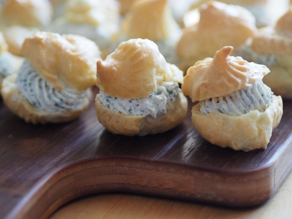 80 g Butter und 20 ml Wasser aufkochen. 120 g Mehl auf ein Mal einrühren, den Herd zurück drehen und mit dem Holzlöffel rühren, bis der Teig sich von der Topfwand ablöst. Auskühlen lassen. Nacheinander drei Eier einarbeiten. In eine Spritztüte füllen. Kleine Röschen auf Backpapier spritzen. Bei 200 Grad 15 Minuten im Backrohr backen. Auskühlen lassen. Die Creme: 2 EL heißer Milch, 60 g Blauschimmelkäse darin auflösen, vom Herd nehmen, mit 200 g Frischkäse zusammenrühren. Mit einer Kräutermischung abmischen.  In einen Spritzbeutel füllen. Die Brandteigkrapfen halbieren. Mit der Käsemischung füllen.