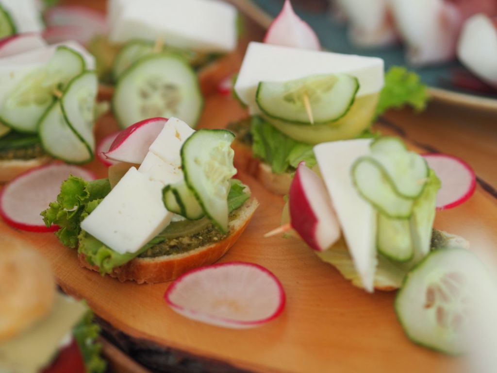 Das selbst gebackene Baguette in Scheiben schneiden und mit Pesto bestreichen. Mit Endiviensalat und gelben Tomaten belegen. Ein Stück Ziegenkäse darauf legen, in dünne Scheiben geschnittene Gurken. Und mit in kaltem Wasser abgelegenen Radieschenscheiben belegen.