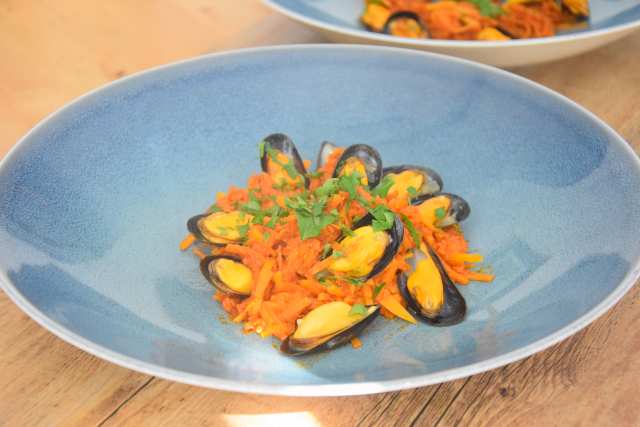 In einer Pfanne 1 TL Kreuzkümmel, 1 TL Currypulver mit 1 ½ EL Olivenöl anrösten. Dann den blanchierten halbierten Rosenkohl (ca. 400 g) dazugeben, mitrösten. Dann 400 g abgetropfte Kichererbsen und 2 in Ringe geschnittene Jungzwiebelstangen in die Pfanne dazugeben und mitrösten. A n r i c h t e n Auf einen schwarzen Teller geben und mit einer Marinade aus dem Saft einer Zitrone, etwas Salz, 1 ½ EL Tahini (Sesampaste), Olivenöl und etwas Wasser vermischen. Mit grob gehacktem Koriander und gerösteten Haselnußkernen bestreuen. Das Sauerteigbrot rösten und dann mit einer halbierten Knoblauchzehe abreiben.