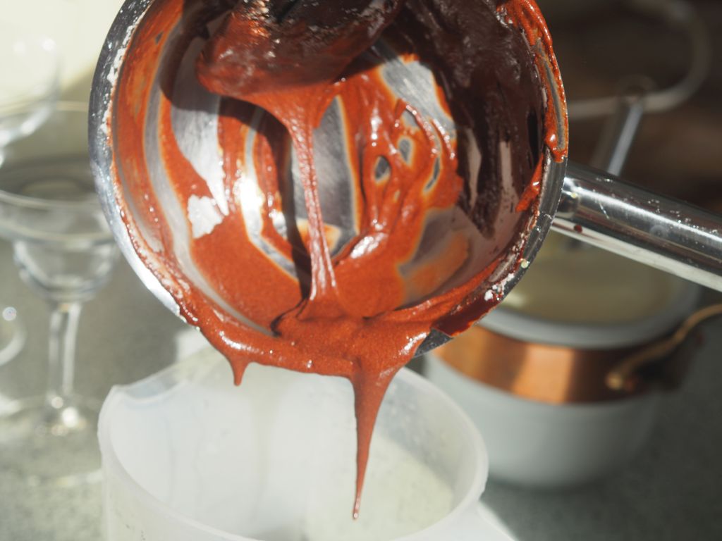Wie ein Teppich schlängelt sich die Schokoladenmasse in den Sabayon.