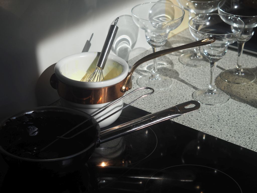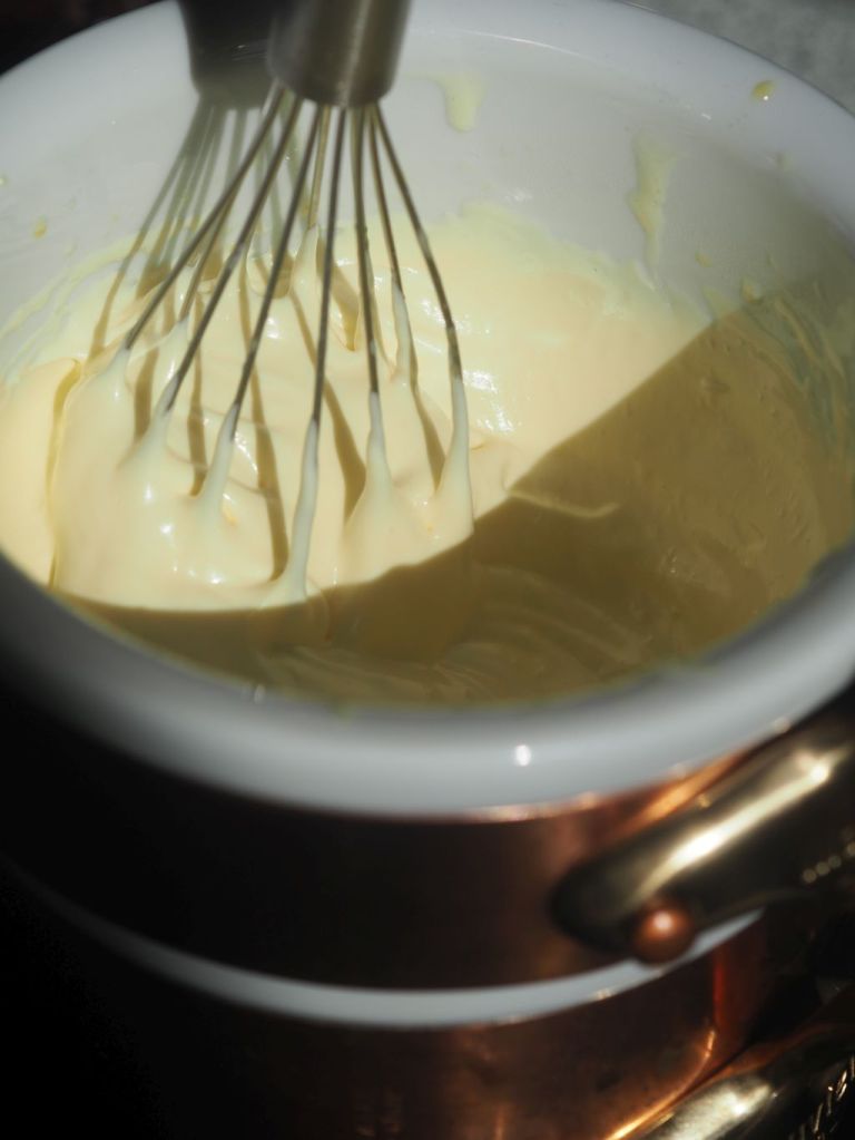 Ohne einer hellen Einbrenn (Einmach, helle Mehlschwitze) geht es nicht: Butter oder Schweineschmalz in einem Topf erwärmen. Genauso viel Mehl wie Butter / Schweineschmalz dazu geben und mit dem Schneebesen verrühren und eine Viertelstunde bei niedriger Temperatur aufschäumen lassen, bis es ganz leicht angeröstet ist. Beim Rösten wird die Stärke aufgespaltet, wodurch der Mehlgeschmack verschwindet und gleichzeitig Röstaromen dazukommen. Damit kann man herrlich Saucen binden, aber auch Rahmfisolen, Kochsalat mit Erbsen, einen Kelch (Kohl auf Wiener Art), etc…. keine klassische Küche kommt ohne Einbrenn aus.