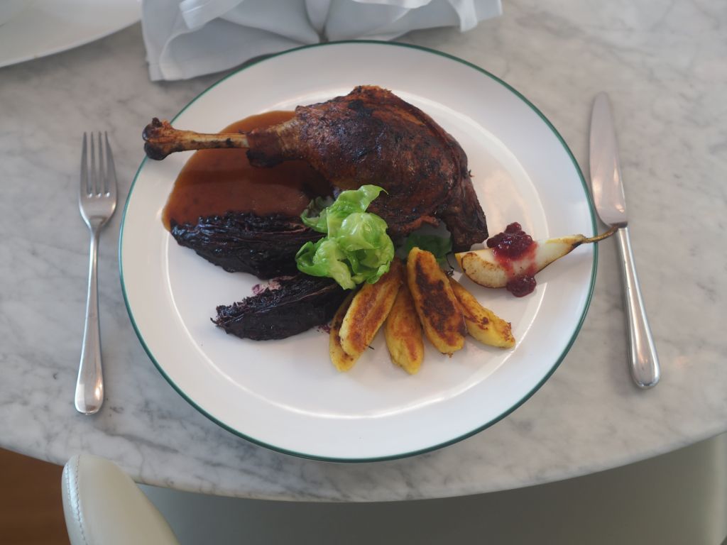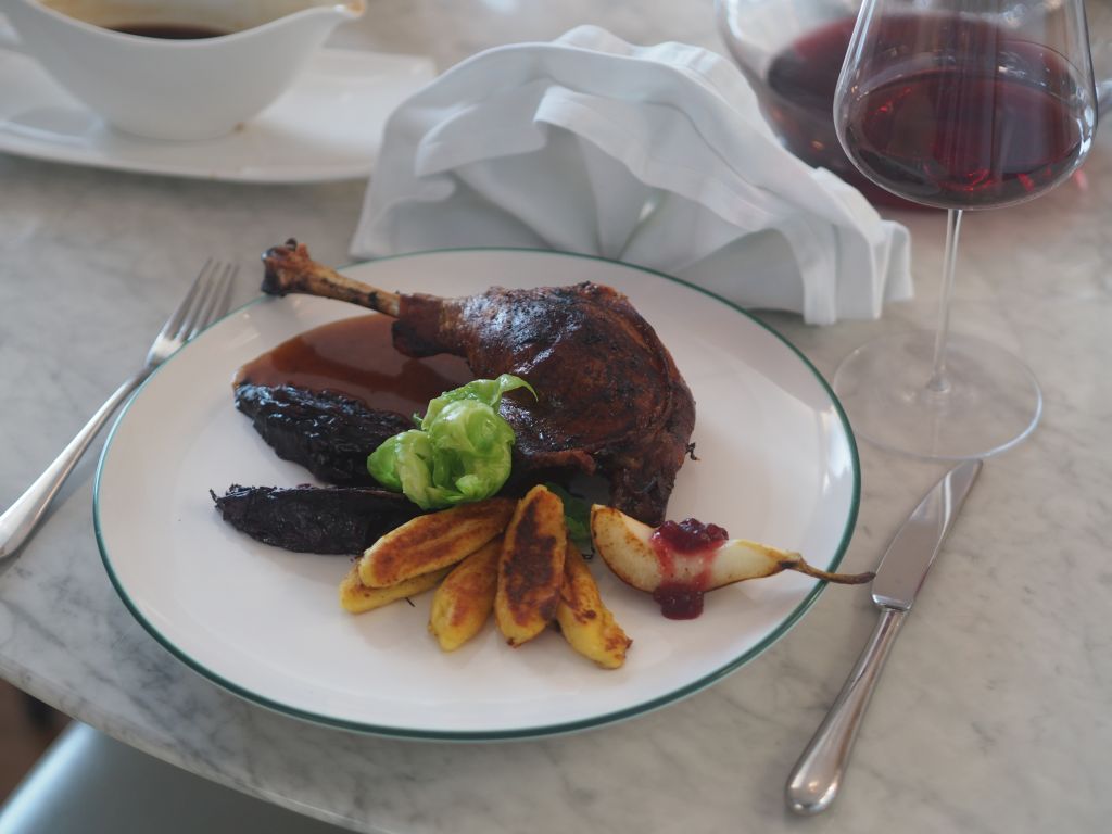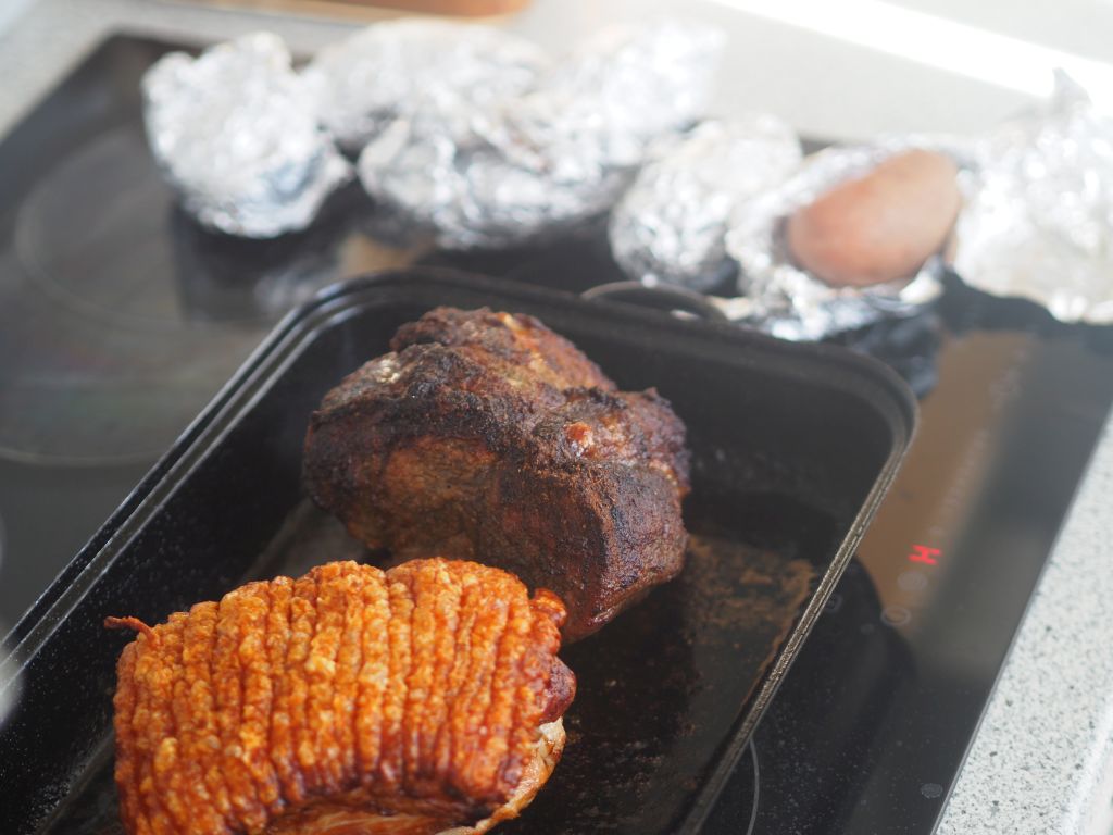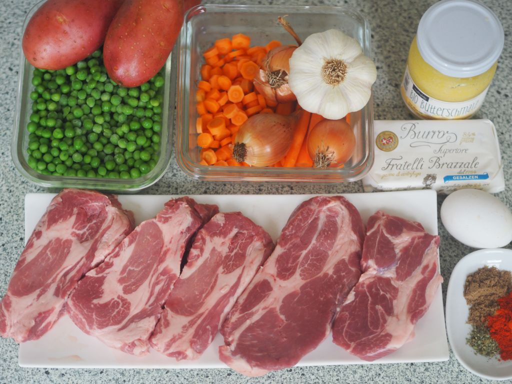 2 Karotten, ¼ Sellerieknolle, 7 mittlere rote Zwiebel, in grobe Stücke schneiden. Mit einem Stück Selchspeck im Bräter anbraten. 5 in Scheiben geschnittene Knoblauchzehen in den Bräter geben. Mitrösten. Die äußeren 3 Stangen einer Selleriestaude, die auch in grobe Stücke geschnitten wurden, in den Bräter geben. Mitrösten. Mit Portwein ablöschen, vollständig einköcheln. Mit Rinderfond aufgießen. Gewürze – Lorbeerblatt, Pimentkörner, Pfeffer, Wacholderbeeren dazugeben und auf die Seite stellen. Die P a s t e vorbereiten: 1 TL Butterschmalz in einem kleinen Topf erwärmen. 2 EL Kümmel, 2 EL getrockneten Majoran, 2 TL Salz und 10 geriebene Knoblauchzehen und für die Farbe 1 EL Paprikacreme zusammenrühren, bis man eine Paste kriegt. Mit dieser Paste den 2 kg Mangalitza-Schopfbraten schön einmassieren. Das Fleisch in den Bräter legen und noch 3 bis 4 kleine Scheiben getrocknetes Roggenbrot für die Sämigkeit hineingeben. Bei 180°C für 50 Min. ins Backrohr schieben. Herausheben und das Fleisch umdrehen, Flüssigkeit nachfüllen, wenn nötig. Und 40 Min. braten. Dann herausnehmen, das Fleisch aus dem Bräter nehmen und in einen sauberen Bräter umbetten, nochmal umdrehen, weitere 20 Min. bei 180°C in den Ofen schieben. S o ß e Das Gemüse durch ein groben Sieb abseihen und mit dem Gummispatel durchdrücken, damit man ein bißchen Konsistenz hat. Dann mit der Fettkanne trennen. Auf die Seite stellen. In der Z w i s c h e n z e i t während der Schopfbraten im Ofen bratet, die Schwarzwurzeln vorbreiten. Die Schwarzwurzeln schälen, in Essigwasser einlegen. Die Schwarzwurzeln in einem Dampfgarer dämpfen, bis sie bißfest sind, herausheben und in 5 cm große Stücke schneiden, in Butterschmalz in einer Pfanne anbraten. Dann mit 250 ml Sahne aufgießen, aufkochen, einköcheln. Auf die Seite stellen. Kurz vor dem Servieren, 50 ml Sahne aufschlagen, Zitronenschalenabrieb, Salz wenn nötig, und kleingehackten frischen Kren hineingeben. Ein zwei Minuten auf dem Herd durchziehen lassen. Vom Herd ziehen und die frisch geschlagene Sahne unterrühren, sofort servieren. S c h w a r z b r o t k n ö d e l 300g altbackenes Roggenbrot, die Brotrinde abschneiden, ergibt 100 g Rinde, diese in der Zauberrette zu Bröseln verarbeiten. Das restliche Brot würfeln. 2 kleine Zwiebel in Butterschmalz goldbraun anbraten. 100 ml Milch aufgießen und wärmen. Salz und geriebene Muskatnuß hineingeben und gehackte Petersilie. Diese Mischung auf die Brotwürfel geben, zusammenkneten, wenn nötig Stärke oder Mehl reingeben, Knödel mit der Hand formen. Im Dampfgarer fertig dämpfen. Durch die Brotbrösel walzen und sofort servieren.