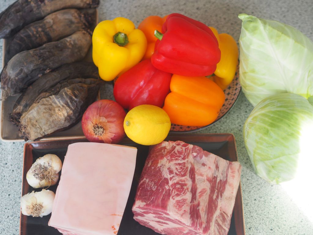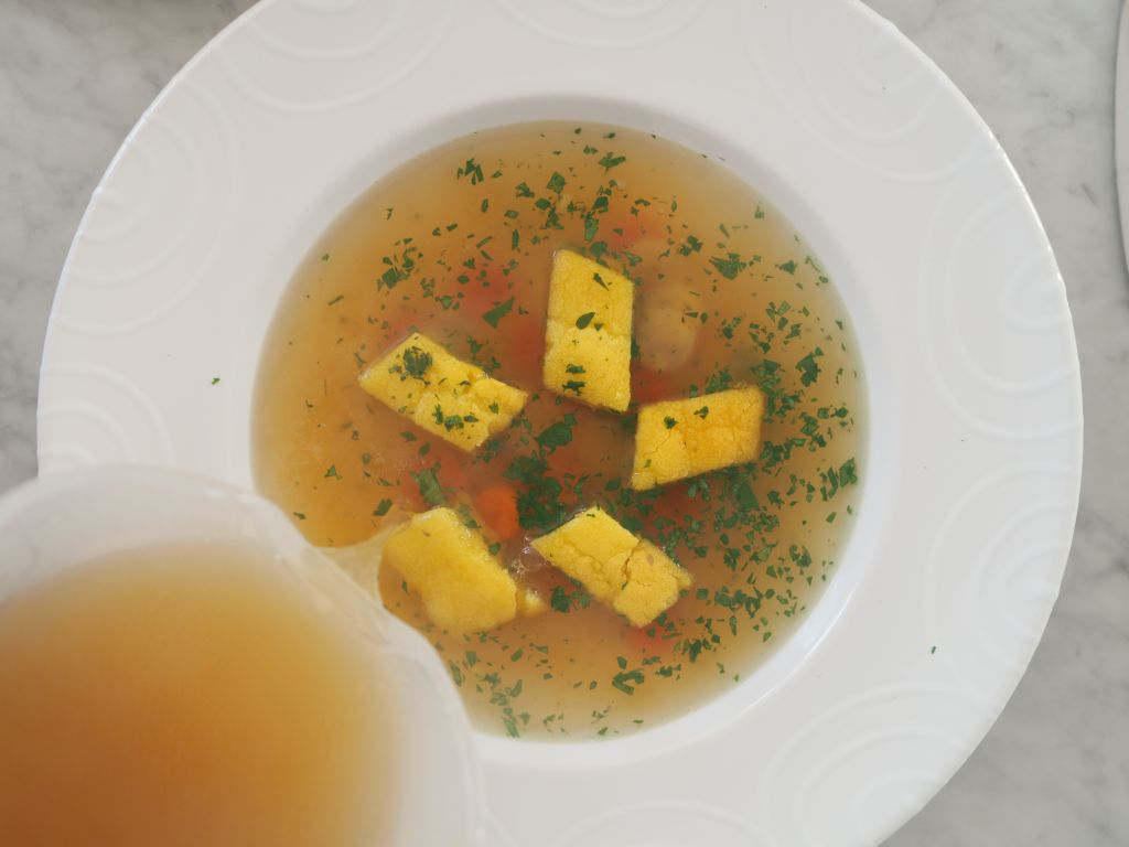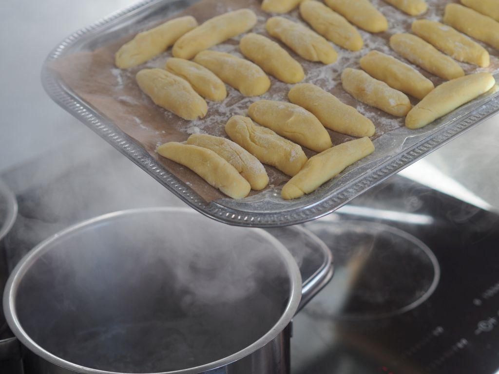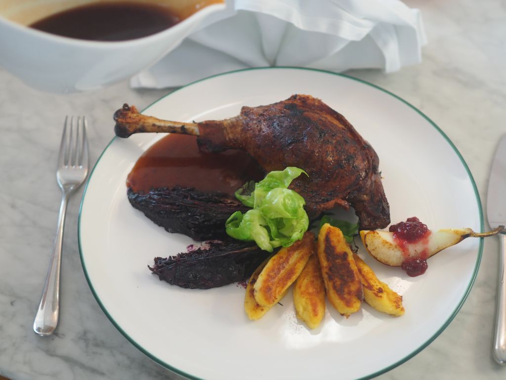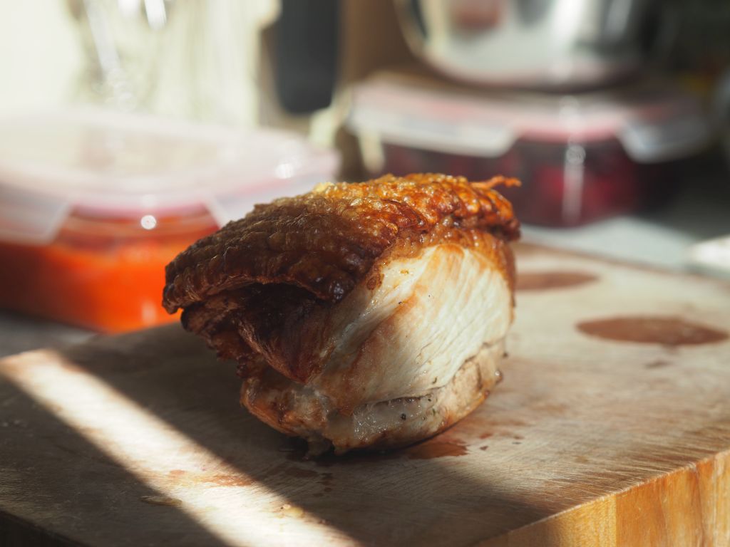 2 Karotten, ¼ Sellerieknolle, 7 mittlere rote Zwiebel, in grobe Stücke schneiden. Mit einem Stück Selchspeck im Bräter anbraten. 5 in Scheiben geschnittene Knoblauchzehen in den Bräter geben. Mitrösten. Die äußeren 3 Stangen einer Selleriestaude, die auch in grobe Stücke geschnitten wurden, in den Bräter geben. Mitrösten. Mit Portwein ablöschen, vollständig einköcheln. Mit Rinderfond aufgießen. Gewürze – Lorbeerblatt, Pimentkörner, Pfeffer, Wacholderbeeren dazugeben und auf die Seite stellen. Die P a s t e vorbereiten: 1 TL Butterschmalz in einem kleinen Topf erwärmen. 2 EL Kümmel, 2 EL getrockneten Majoran, 2 TL Salz und 10 geriebene Knoblauchzehen und für die Farbe 1 EL Paprikacreme zusammenrühren, bis man eine Paste kriegt. Mit dieser Paste den 2 kg Mangalitza-Schopfbraten schön einmassieren. Das Fleisch in den Bräter legen und noch 3 bis 4 kleine Scheiben getrocknetes Roggenbrot für die Sämigkeit hineingeben. Bei 180°C für 50 Min. ins Backrohr schieben. Herausheben und das Fleisch umdrehen, Flüssigkeit nachfüllen, wenn nötig. Und 40 Min. braten. Dann herausnehmen, das Fleisch aus dem Bräter nehmen und in einen sauberen Bräter umbetten, nochmal umdrehen, weitere 20 Min. bei 180°C in den Ofen schieben. S o ß e Das Gemüse durch ein groben Sieb abseihen und mit dem Gummispatel durchdrücken, damit man ein bißchen Konsistenz hat. Dann mit der Fettkanne trennen. Auf die Seite stellen. In der Z w i s c h e n z e i t während der Schopfbraten im Ofen bratet, die Schwarzwurzeln vorbreiten. Die Schwarzwurzeln schälen, in Essigwasser einlegen. Die Schwarzwurzeln in einem Dampfgarer dämpfen, bis sie bißfest sind, herausheben und in 5 cm große Stücke schneiden, in Butterschmalz in einer Pfanne anbraten. Dann mit 250 ml Sahne aufgießen, aufkochen, einköcheln. Auf die Seite stellen. Kurz vor dem Servieren, 50 ml Sahne aufschlagen, Zitronenschalenabrieb, Salz wenn nötig, und kleingehackten frischen Kren hineingeben. Ein zwei Minuten auf dem Herd durchziehen lassen. Vom Herd ziehen und die frisch geschlagene Sahne unterrühren, sofort servieren. S c h w a r z b r o t k n ö d e l 300g altbackenes Roggenbrot, die Brotrinde abschneiden, ergibt 100 g Rinde, diese in der Zauberrette zu Bröseln verarbeiten. Das restliche Brot würfeln. 2 kleine Zwiebel in Butterschmalz goldbraun anbraten. 100 ml Milch aufgießen und wärmen. Salz und geriebene Muskatnuß hineingeben und gehackte Petersilie. Diese Mischung auf die Brotwürfel geben, zusammenkneten, wenn nötig Stärke oder Mehl reingeben, Knödel mit der Hand formen. Im Dampfgarer fertig dämpfen. Durch die Brotbrösel walzen und sofort servieren.