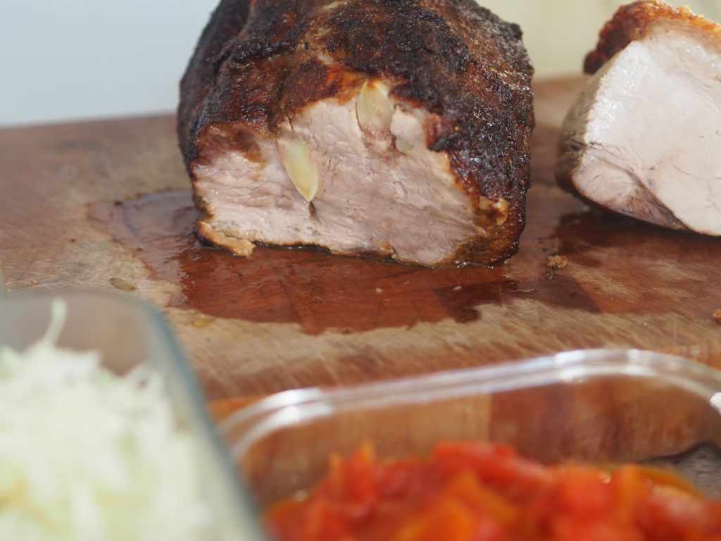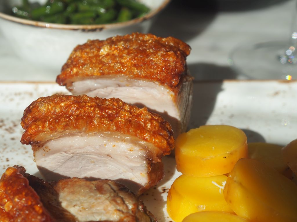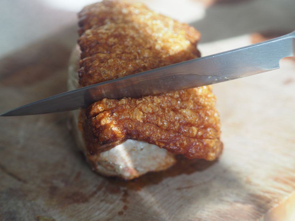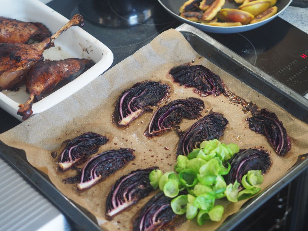 Als Vorspeise gab es Katonák (Soldaten) vom Mangalitza-Speck, daher kam zum Schweinsbraten auch noch Kraut mit Mangalitza-Speck. REZEPT Mangalitza-Speck klein würfeln. Auf mittlerer Hitze in der Bratpfanne leise anbraten, und das Fett langsam auslassen. 2 kleine fein gehackte Zwiebel dazu geben. Anbraten. Dann mit Honig karamelisieren. Mit rotem Balsamico-Essig ablöschen. Ganz einköcheln. Dann das feingeschnittene Kraut, die Hälfte haben die Kuckackák aufgefressen, in die Bratpfanne geben. Gut durchrühren, salzen. Ein bißchen Wasser dazu, gemahlener Kümmel rein und zugedeckt 20 Min. schmoren lassen.