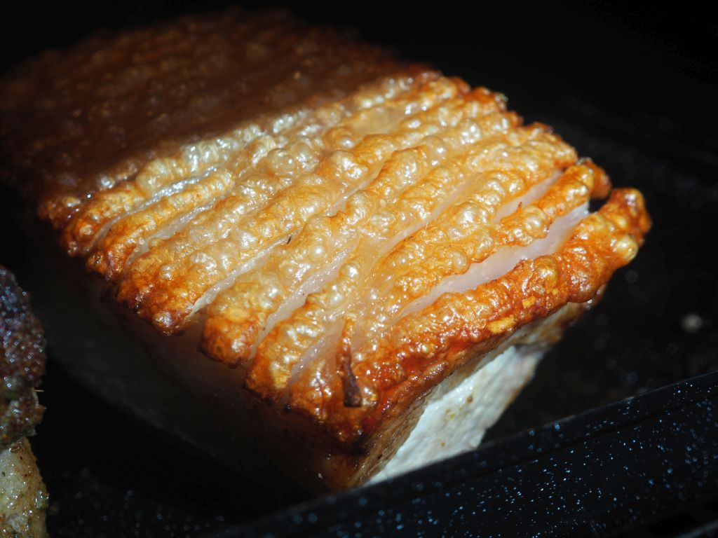 Das Mangalitza-Schwein ist das Olivenöl unter den Schweinen. Im Vergleich zu anderen Schweinerassen liegt der Anteil an ungesättigten Fettsäuren ziemlich hoch. Das glaubt man kaum, ist aber so und nein, das haben wir nicht aus der Regenbogenpresse1. Leider wird die Schwarte von der Schinkenmanufaktur Thum abgeschnitten, sodaß wir mit den Fetteinsprengseln im Fleisch unser Auslangen finden müssen. Wir haben das auf dem Stand von Thum auf der Freyung gleich angesprochen. Und ja es wäre möglich, Fleisch mit Schwarte zu bestellen.