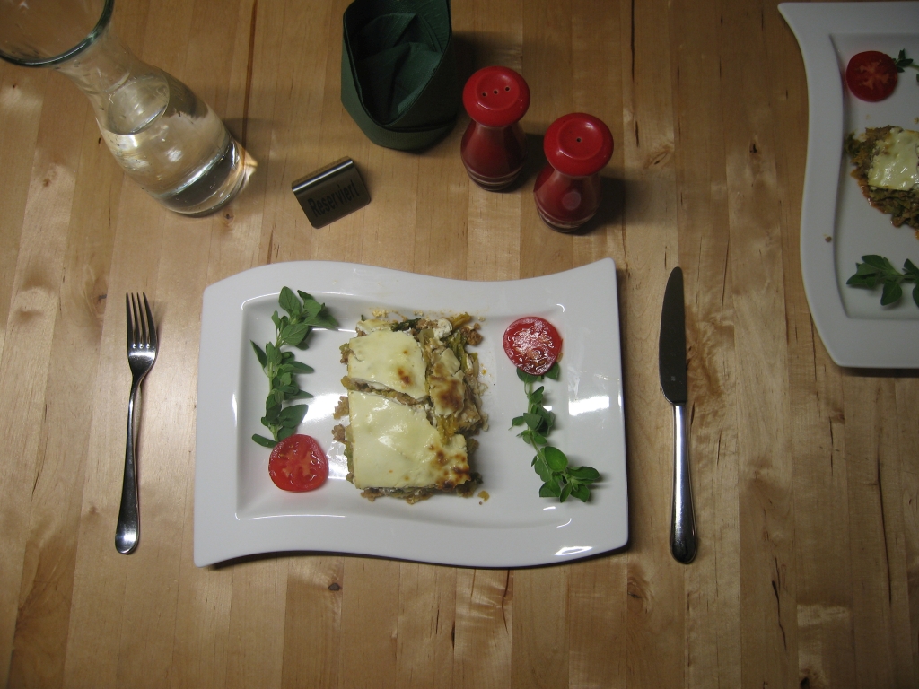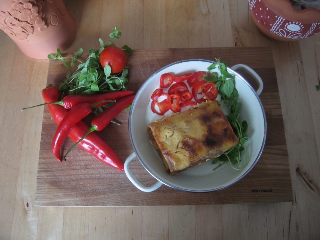 Diesen Auflauf – einmal mit Kohl und einmal mit Fisolen (dt. Grüne Bohne oder Gartenbohne) – hatten wir zum Mittagessen im Büro.