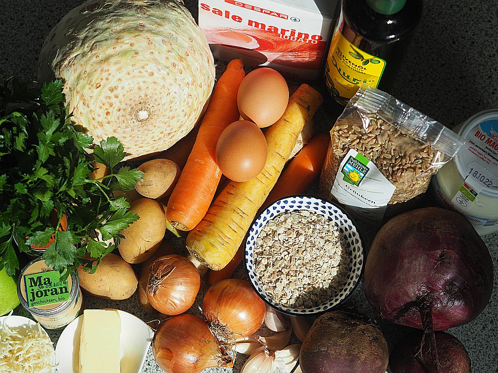 Nockerln 200 g weiche Irish Butter, einen TL Salz und eine gute Prise Muskatnuß schaumig rühren. 4 Dotter und 4 Eier so nach und nach in die Butter einarbeiten, darauf achten. Daß die Eier Zimmertemperatur haben. 160 g Semmelbrösel nach und nach dazugeben und gut verrühren. 2 h im Kühlschrank rasten lassen. In der Zwischenzeit das Gemüse zubereiten: ½ kg Karotten schälen und in 2 mm dicke Scheiben schräg einschneiden. 300 ml Gemüsesuppe aufkochen, die Karotten dazugeben, bißfest kochen, dann 200 g TK-Erbsen dazugeben, 3 – 4 EL Schlagobers einrühren und mit Maistärke binden. Wieder zu den Nockerln: in jede Hand einen Löffel nehmen, eine Portion aus dem Teig schöpfen und mit den Löffeln zu Nockerln formen. Salzwasser aufkochen. Die Nockerln hineingeben, das Wasser auf mittlere Hitze 8 -10 Min. ziehen lassen. Anrichten Mit Schnittlauch bestreuen.