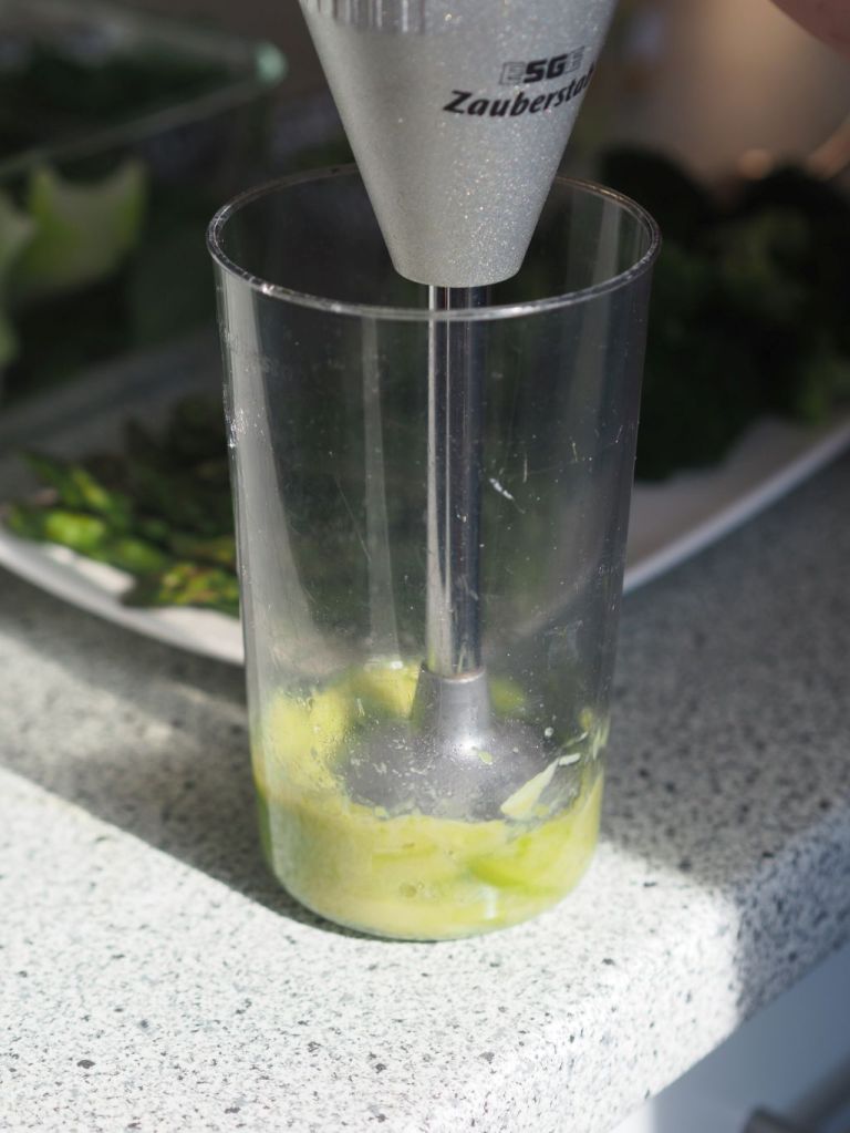 2 L Wasser, 25 g Salz und 20 geschälte und mit einem breiten Messer angedrückte Knoblauchzehen aufkochen. Zusätzlich werden noch vier große, nicht zerdrückte Knoblauchzehen mitgekocht, das wird im Suppenkochbuch nicht ausdrücklich erwähnt, man sieht aber auf einem Bild eine weiße Kugel in der Suppe schwimmen, das muß eine Knoblauchzehe sein. Sodann 2 Nelken, 5 im Mörser zerstoßene weiße Pfefferkörner und 2 Salbeistengel (heißen bei Brodmann Salbeiästchen, vielleicht ist das eine typisch Schweizerische Ausdrucksweise) mitkochen, wir taten dies etwa eine Viertelstunde. Die Salbeistengel und die ganzen Knoblauchzehen herausnehmen und mit einem Schöpflöffel den Knoblauch durch ein Sieb auspressen, dann mit einer Teigkarte die Knoblauchmasse durchdrücken. (Vom Sieb steht nichts im Kochbuch, man sieht es aber am Begleitbild, auch nichts von der Teigkarte). Anrichten Brotscheiben mit Hartkäse (wir Vorarlberger Bergkäse) bestreuen, mit Olivenöl beträufeln und im Backrohr eine Minute lang überbacken. Die Suppe über die Brote gießen.