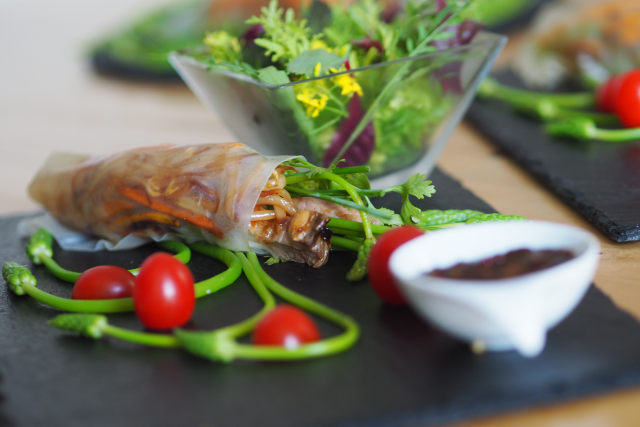 Gemüse und Pluma, einem Strang aus dem Schweinskarree, das in einer Marinade gebadet wurde, in Reispapier eingewickelt. Dazu Asia-Salat.