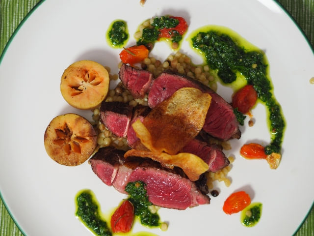 Gebratenes Entrecote vom Scotch Beef. Mit Ofentomaten, Fregola Sarda und der erwachenden Jahreszeit entsprechend mit Bärlauchpesto. Dazu Kartoffelchips. Shane McMahon will ein irisches Entrecote. Eines von einem Rind, das auf den saftigen Hügeln und Wiesen Schottlands gegrast hat, ist es geworden. Schwierig war es, die Fregola Sarda zu bekommen. Hierbei wollten wir uns an die Originalrezeptur halten und nicht etwa auf Tarhonya ausweichen, obwohl wir die auch mögen. Denn nur Fregola sarda ist geröstet, sie läuft auch unter der Bezeichnung Fregola tostata.