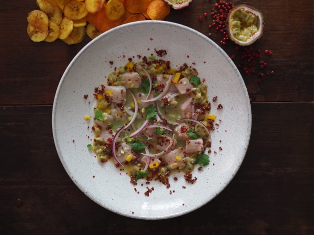 Aber mit Forelle! Dieser heimische Fisch lässt uns an tropische Gefilde denken: eine ungewöhnliche Kombination und doch steht die Forelle in völligem Einklang mit Quinoa, der süßlich-sauren Maracuja und den peruanischen Klassikern Süßkartoffel- und Kochbananenchips. Die Tigermilch, in der die Forelle ein Bad nimmt, gehört zum Standardrepertoire der peruanisch-japanischen Küche.