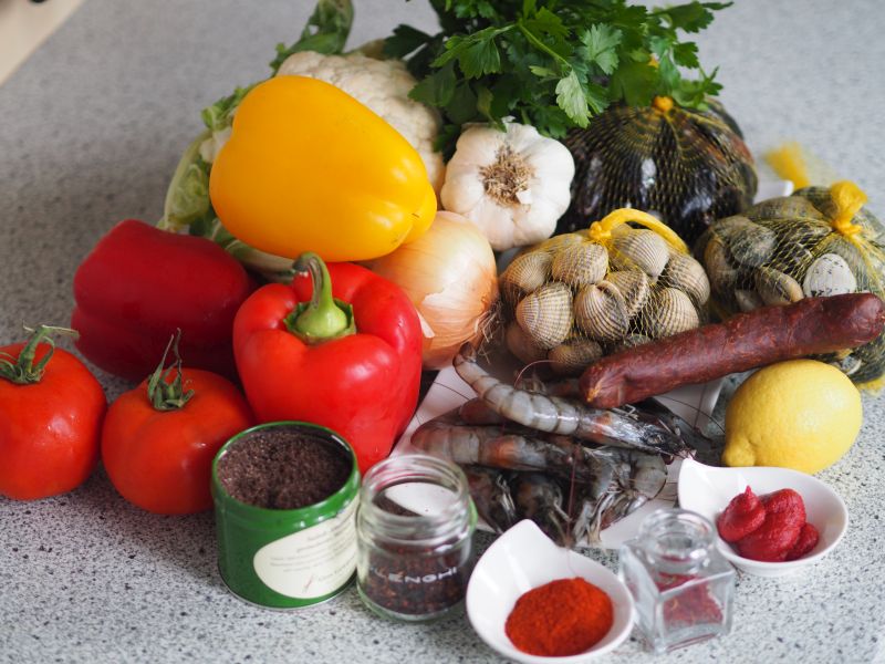 Andalusien war ja das Armenhaus Spaniens, das heißt das Hinterland der Costa del Sol, um Valencia ; – – und von der kommt ja die Paella Andaluz her, die Paella für Arme; – also nicht mit Garnelen und Co. Stattdessen Hasen- und Hühnerfleisch. Was halt so kreucht und fleucht auf einem Bauernhof. Hasenstall hab ich noch als Kind erlebt, am Hof herumlaufende Hühner auch. Bei uns ist es mindestens so heiß wie in Andalusien und deshalb gibt es bei uns genau das, nach einem Rezept im „Grand Livre de Cuisine“ nur ohne Safran; – kann ich mir nicht vorstellen, daß das teuerste Gewürz dem andalusischen Kleinbauern zur Verfügung stand. Das heißt, Moment, doch! Safran wird in Andalusien seit langem angebaut.