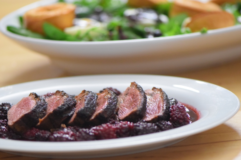 Die Entenbrust mit heißen Brombeeren zum Salat mit Löwenzahn und Rucola dazu eine Heidelbeer-Vinaigrette. Und Yorkshire Pudding. Hasenfutter mal anders. Aber alles paleo.