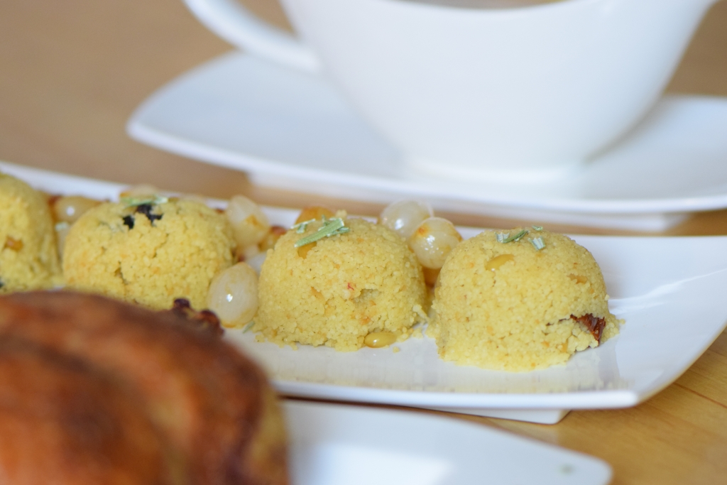 Abgesehen von der Weihnachtsgans und dem Weihnachtskarpfen gibt es auch das Weihnachtshuhn mediterraner Provenienz gefüllt mit getrockneten Pfirsichen, Rosinen und Pflaumen. Als Beilage ein Salat aus Navettes, gelbe Rübchen und gebratenen Apfelspalten.