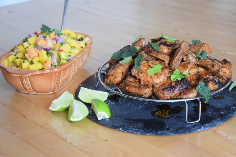 Scharfe Hähnchenkeulen mit Papaya-Mango-Salsa