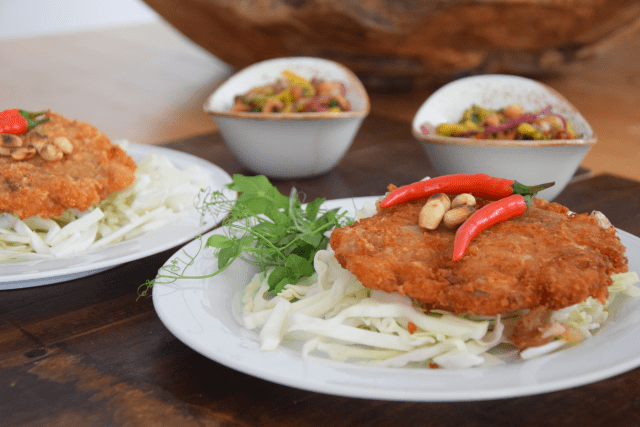 Frittierte Zucchiniblüten aus Wien. Gefüllt mit Ziegenfrischkäse und Ziegenschnittkäse („Goaßkäs“) aus dem Waldviertel. Und gewürzt mit Majoran, der direkt von der hauseigenen Terrasse kam.