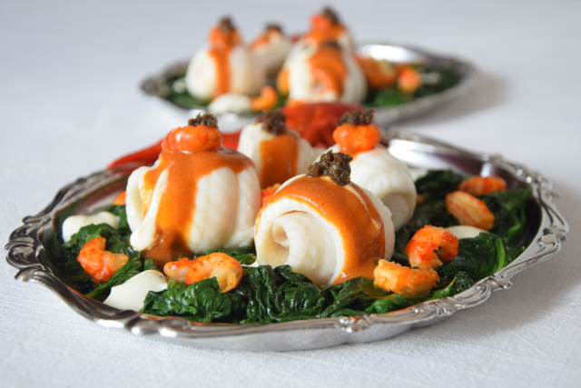Den oberen Teil der Tomaten abschneiden, Kerne auslöffeln, salzen. Scamorza-Käse in Stücke schneiden und in die Tomaten hineinstopfen.