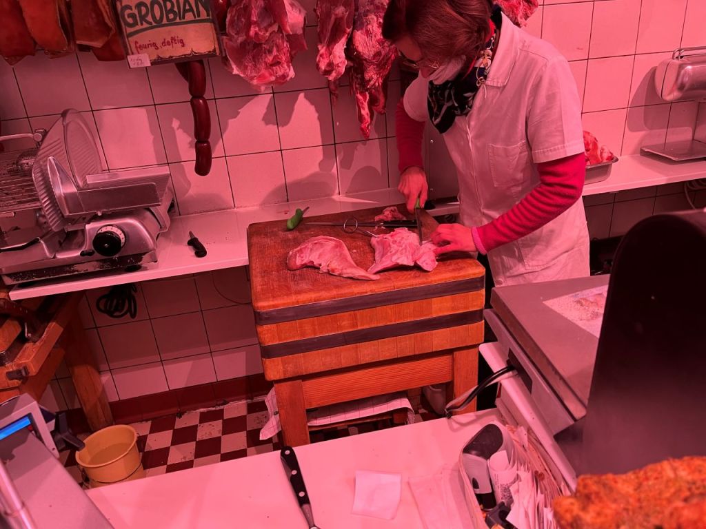Gleich in der Früh, am letzten Tag vor dem allgemeinen Lockdown in Österreich fuhren wir wie jeden Samstag zur Fleischerei Ringl. Dort aß ich meine obligatorische Leberkässemmel, dieses Mal: Käsleberkässemmel, und kauften wir fein geschnittene Kalbschnitzeln, die Schnitzeln wurden schon geklopft, dazu Schweineschmalz, ein weißes Scherzel vom Kalb, wunderschön geschnitten, schon vorbereitet für die Spieße, Wildschweinkoteletts, Beinfleisch und Knochen für die Rindsuppe für den Kartoffelsalat, der zum Schnitzel gehört, die wird heute noch gemacht und Schinken und Speck und Burenwurst, etc. pp. Daran anschließend fuhren wir zum Rist auf der Triester Bundesstraße, ein Großhändler für die Gastronomie, der auch viele Schätze hat, die das Herz eines Kochaficionados höher schlagen läßt. Vor allem die Ausstellung mit den Tellern, Schüsseln, u.s.w. etwa von „steelite“, Made in Chine Britain, hat es uns angetan. Wir kauften Kaffeetassen, Suppenteller, Schalen, Teller, eine Etagere, etc. pp. Nach einer netten Plauderei mit dem Grandseigneur des österreichischen Gastronomiebedarfs, Herrn Theodor Rist, fuhren wir nach Hause. Somit haben wir die Weihnachtsbesorgungen abgeschlossen, das Weihnachtsgeld ist zwar noch nicht am Konto, aber die Vorweihnachtszeit mit den Einkäufen ist schon vorbei. Der Lockdown Nummer 4 läßt grüßen*.