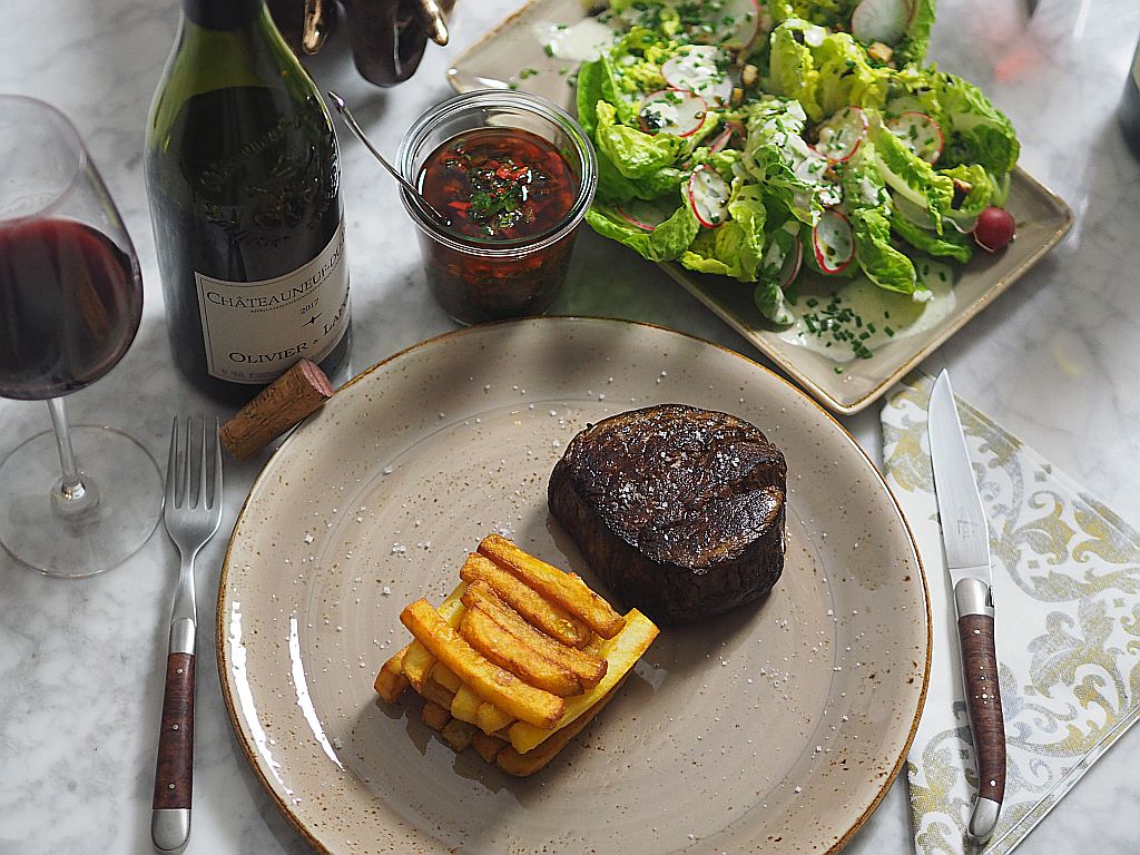 Chimichurri wie hier. Wein: Chateauneuf-Du-Pape, Olivier&Lafont.